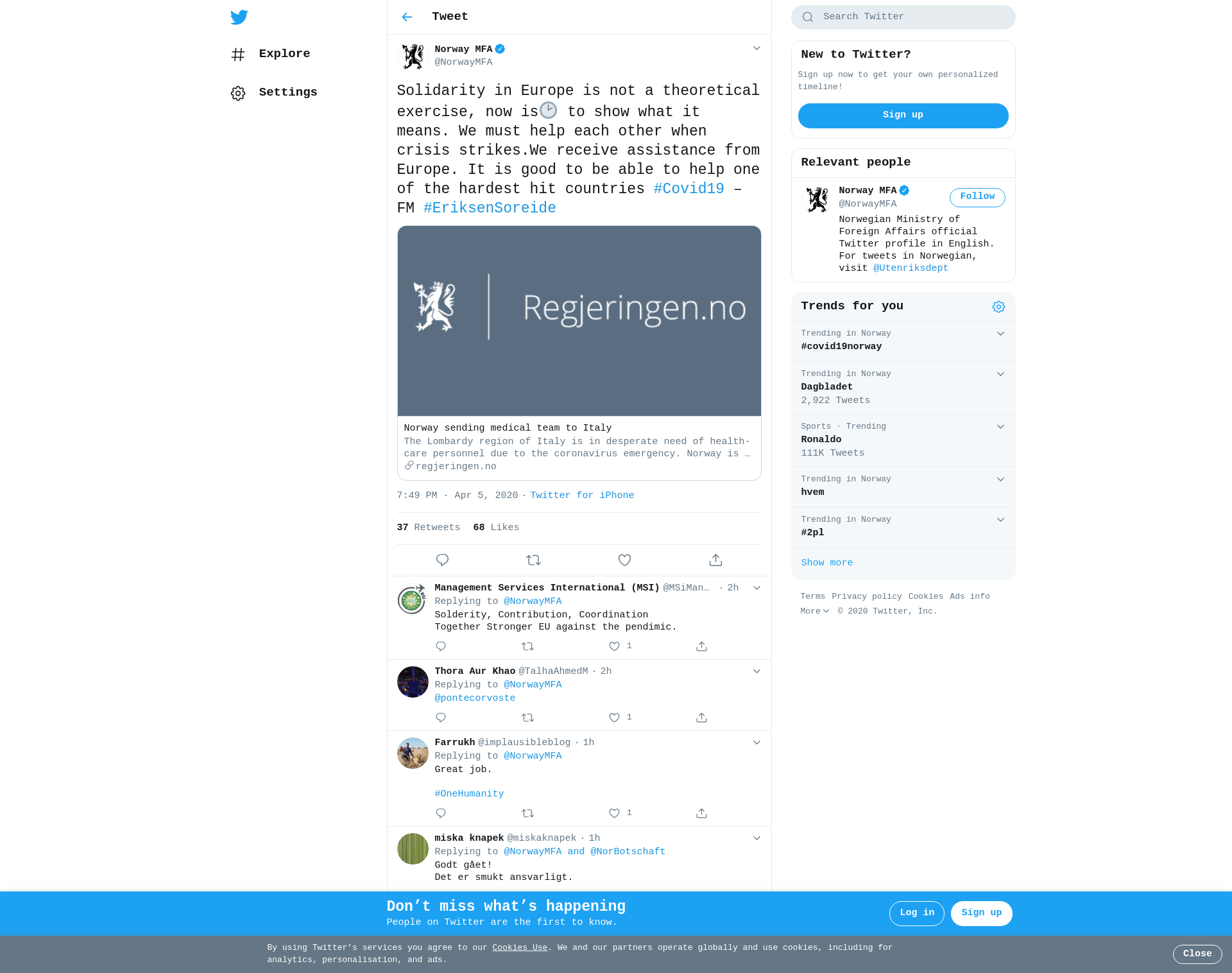Solidarity in Europe is not a theoretical exercise, now is🕑 to show what it means. We must help each other when crisis strikes.We receive assistance from Europe. It is good to be able to help one of the hardest hit countries #Covid19 – FM #EriksenSoreide https://t.co/mrsfzeQBI5