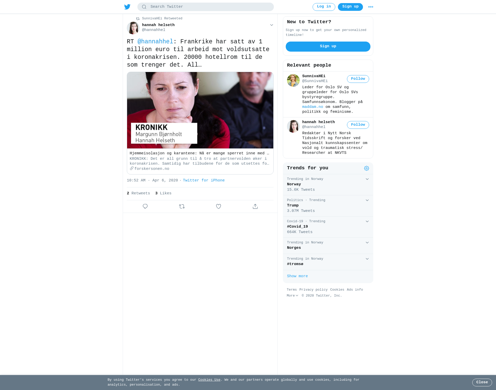RT @hannahhel: Frankrike har satt av 1 million euro til arbeid mot voldsutsatte i koronakrisen. 20000 hotellrom til de som trenger det. All grunn til myndighetene skal handle her også. https://t.co/ePPxkbOVv5