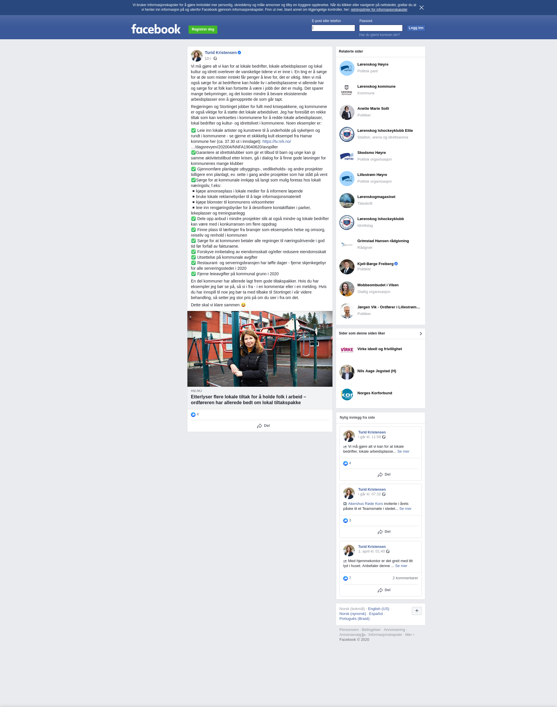Vi må gjøre alt vi kan for at lokale bedrifter, lokale arbeidsplasser og lokal kultur og idrett overlever de vanskelige tidene vi er inne i. En ting er å sørge for at de som mister inntekt får penger å leve for, det er viktig. Men vi må også sørge for at bedriftene kan holde liv i arbeidsplassene vi allerede har og sørge for at folk kan fortsette å være i jobb der det er mulig. Det sparer mange bekymringer, og det koster mindre å bevare eksisterende arbeidsplasser enn å gjenopprette de som går tapt.