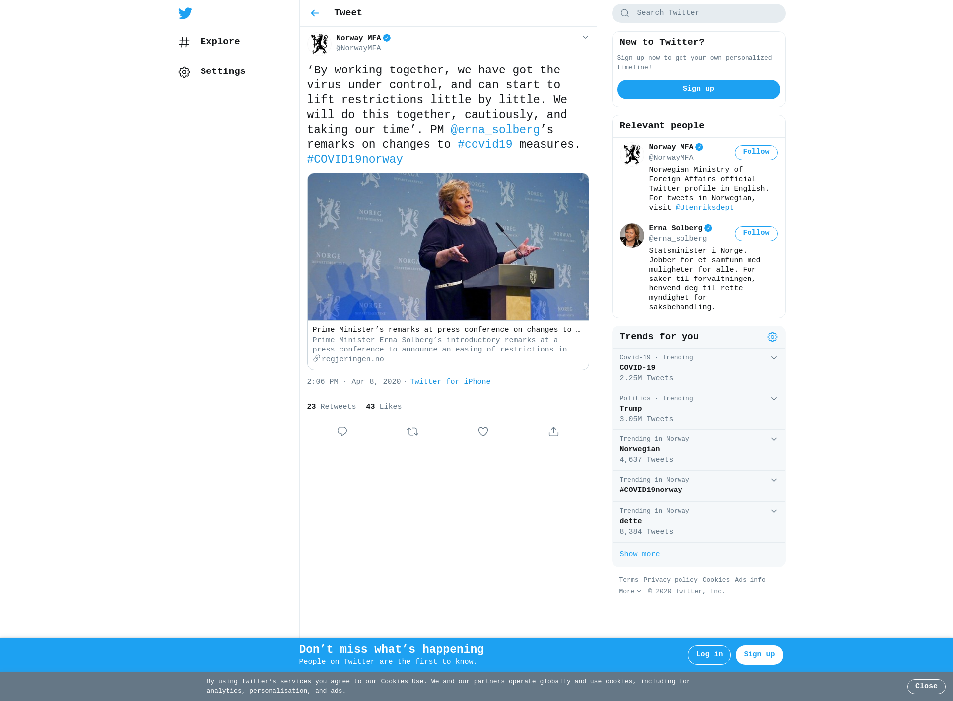 ‘By working together, we have got the virus under control, and can start to lift restrictions little by little. We will do this together, cautiously, and taking our time’. PM @erna_solberg’s remarks on changes to #covid19 measures.