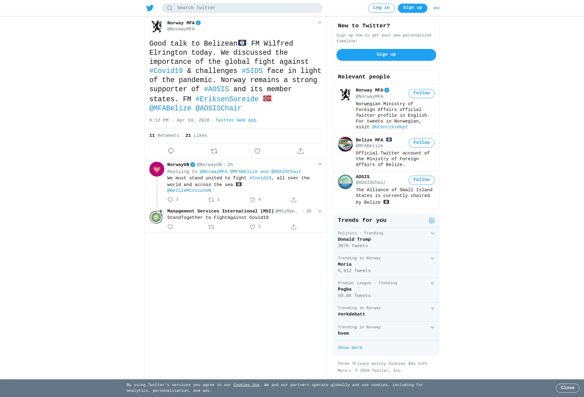 Good talk to Belizean🇧🇿 FM Wilfred Elrington today. We discussed the importance of the global fight against #Covid19 & challenges #SIDS face in light of the pandemic. Norway remains a strong supporter of #AOSIS and its member states. FM #EriksenSoreide 🇳🇴