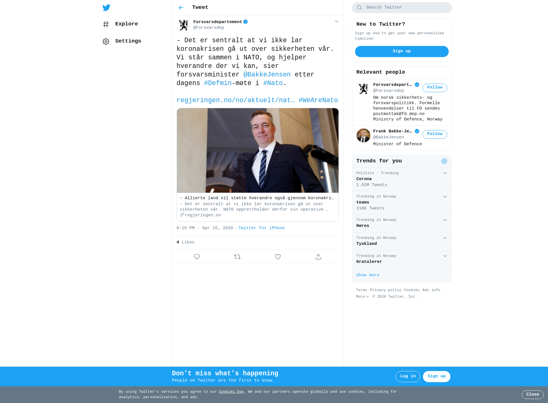 - Det er sentralt at vi ikke lar koronakrisen gå ut over sikkerheten vår. NATO opprettholder derfor sin operative evne og beredskap selv i disse pandemiske krisetider. Vi står sammen i NATO, og hjelper hverandre der vi kan, sier forsvarsminister Frank ...