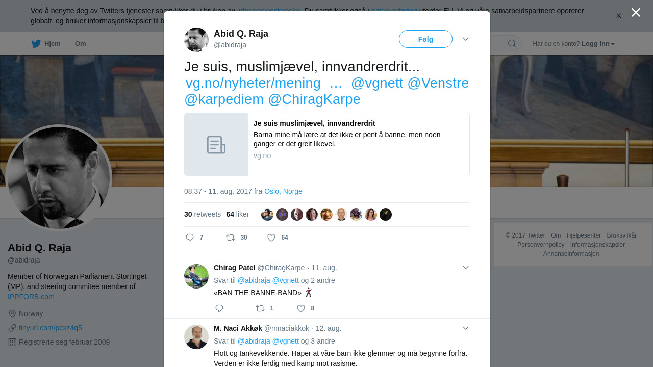 RT @abidraja: Je suis, muslimjævel, innvandrerdrit... https://t.co/Fkie6p8984 @vgnett @Venstre @karpediem @ChiragKarpe