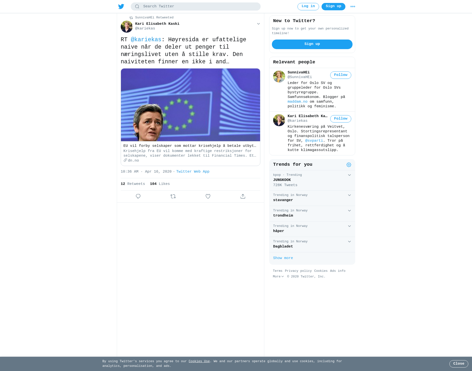 RT @kariekas: Høyresida er ufattelige naive når de deler ut penger til næringslivet uten å stille krav. Den naiviteten finner en ikke i andre land https://t.co/c9uR3OMW4S