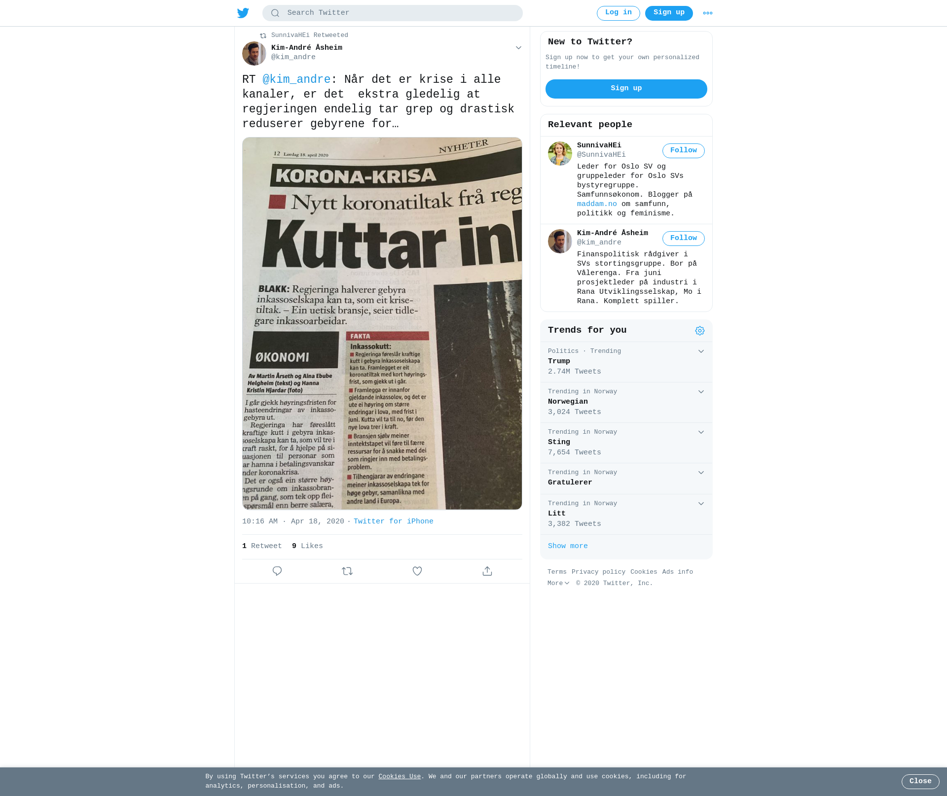 RT @kim_andre: Når det er krise i alle kanaler, er det ekstra gledelig at regjeringen endelig tar grep og drastisk reduserer gebyrene for inkassobransjen. Sånn som mange i bransjen har behandlet folk med økonomiske problemer, bør de nok forvente enda flere innstramminger i årene framover. https://t.co/xUoZYHG0Zo