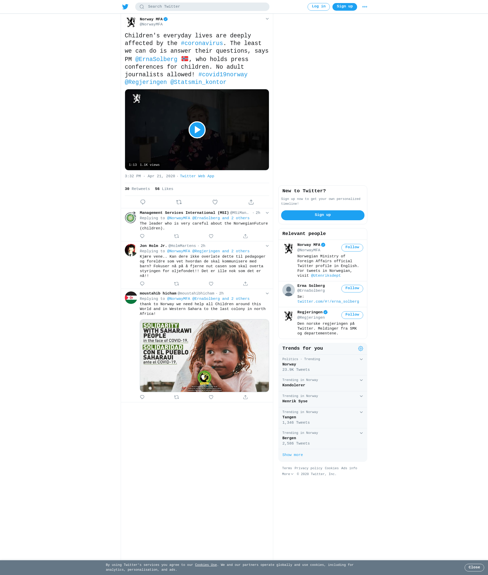 Children's everyday lives are deeply affected by the #coronavirus. The least we can do is answer their questions, says PM @ErnaSolberg 🇳🇴, who holds press conferences for children. No adult journalists allowed! #covid19norway @Regjeringen @Statsmin_kontor https://t.co/RoljWvzob3