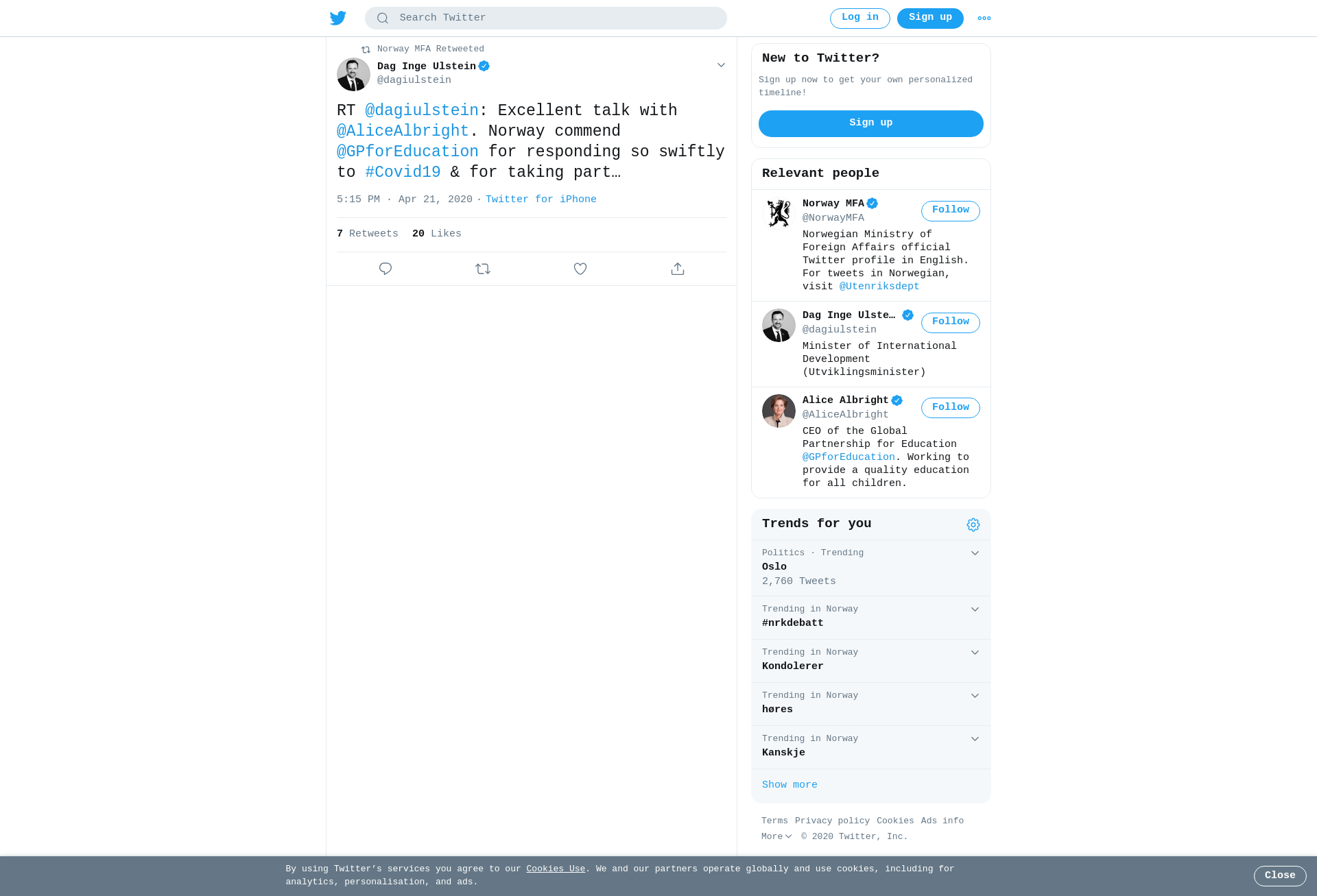 RT @dagiulstein: Excellent talk with @AliceAlbright. Norway commend @GPforEducation for responding so swiftly to #Covid19 & for taking part in the global education response. Now more than ever it is vital that organisations involved in education join forces & coordinate efforts #leavenoonebehind
