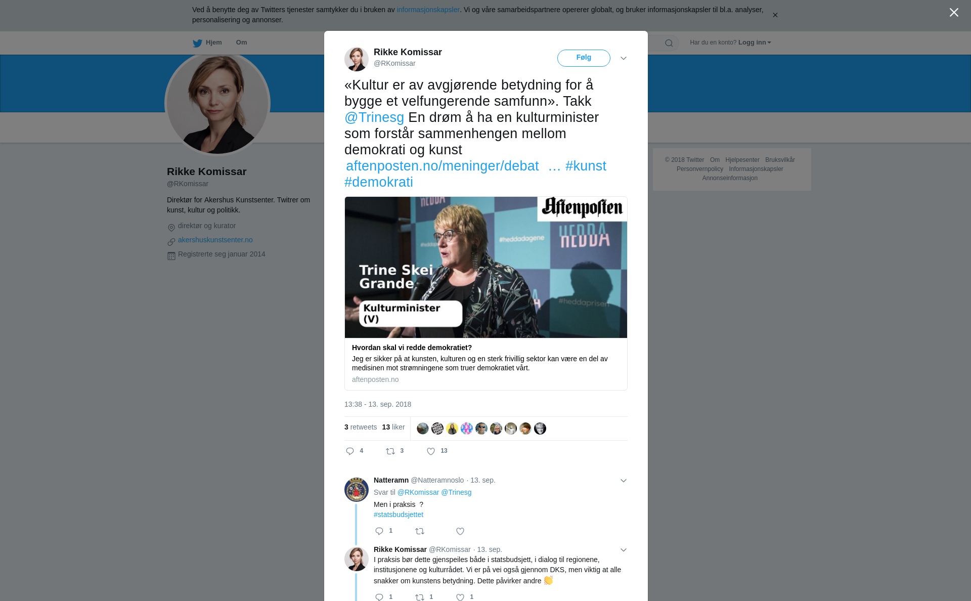 RT @RKomissar: «Kultur er av avgjørende betydning for å bygge et velfungerende samfunn». Takk @Trinesg En drøm å ha en kulturminister som forstår sammenhengen mellom demokrati og kunst https://t.co/41mCakkVlf #kunst #demokrati
