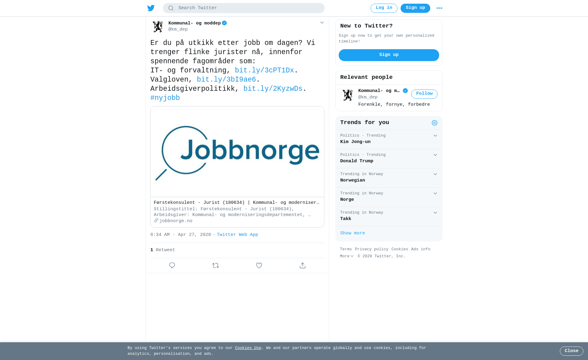 Stillingstittel: Førstekonsulent - Jurist (180634), Arbeidsgiver: Kommunal- og moderniseringsdepartementet, Søknadsfrist: 7. mai 2020