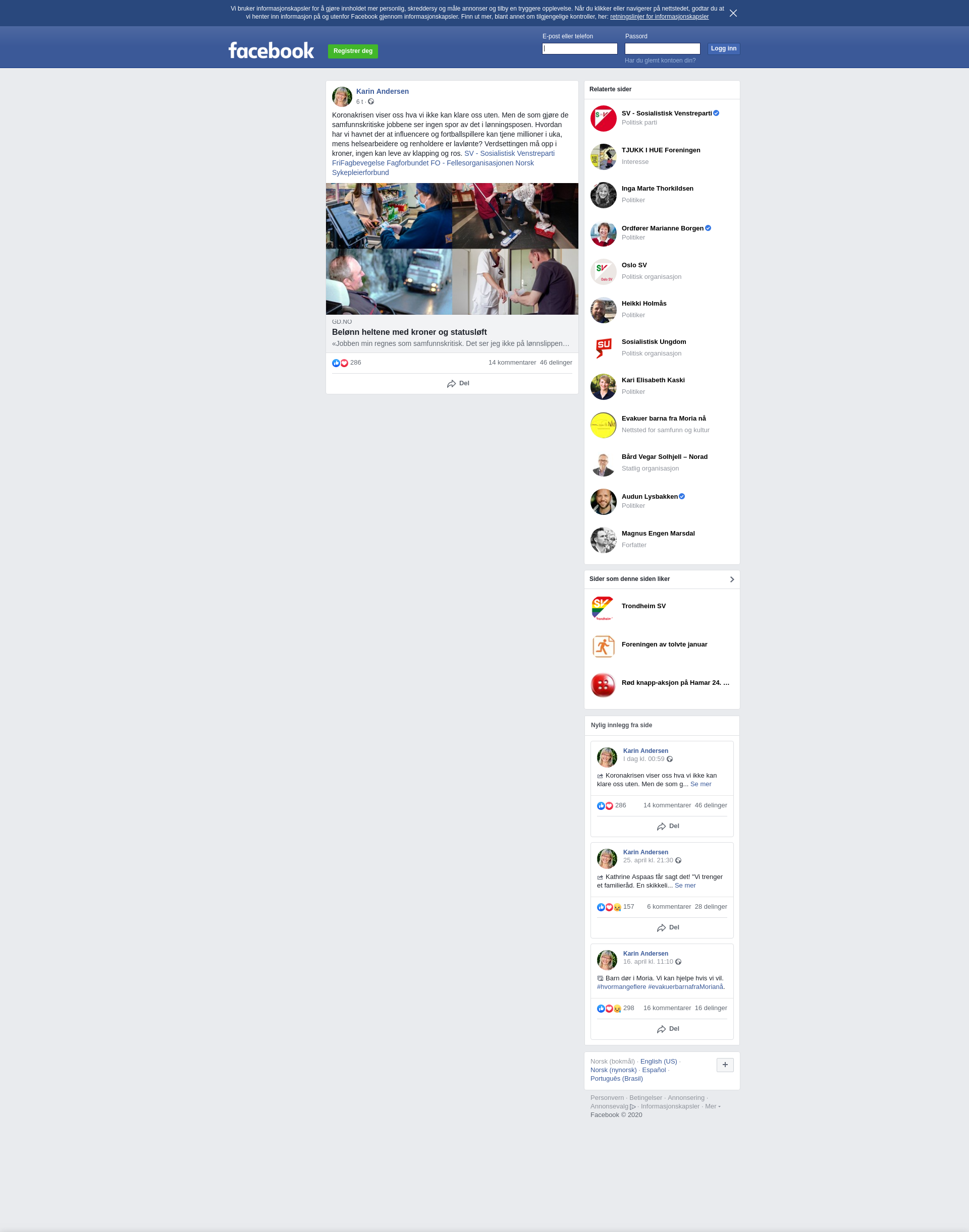 Koronakrisen viser oss hva vi ikke kan klare oss uten. Men de som gjøre de samfunnskritiske jobbene ser ingen spor av det i lønningsposen. Hvordan har vi havnet der at influencere og fortballspillere kan tjene millioner i uka, mens helsearbeidere og renholdere er lavlønte? Verdsettingen må opp i kroner, ingen kan leve av klapping og ros. SV - Sosialistisk Venstreparti FriFagbevegelse Fagforbundet FO - Fellesorganisasjonen Norsk Sykepleierforbund