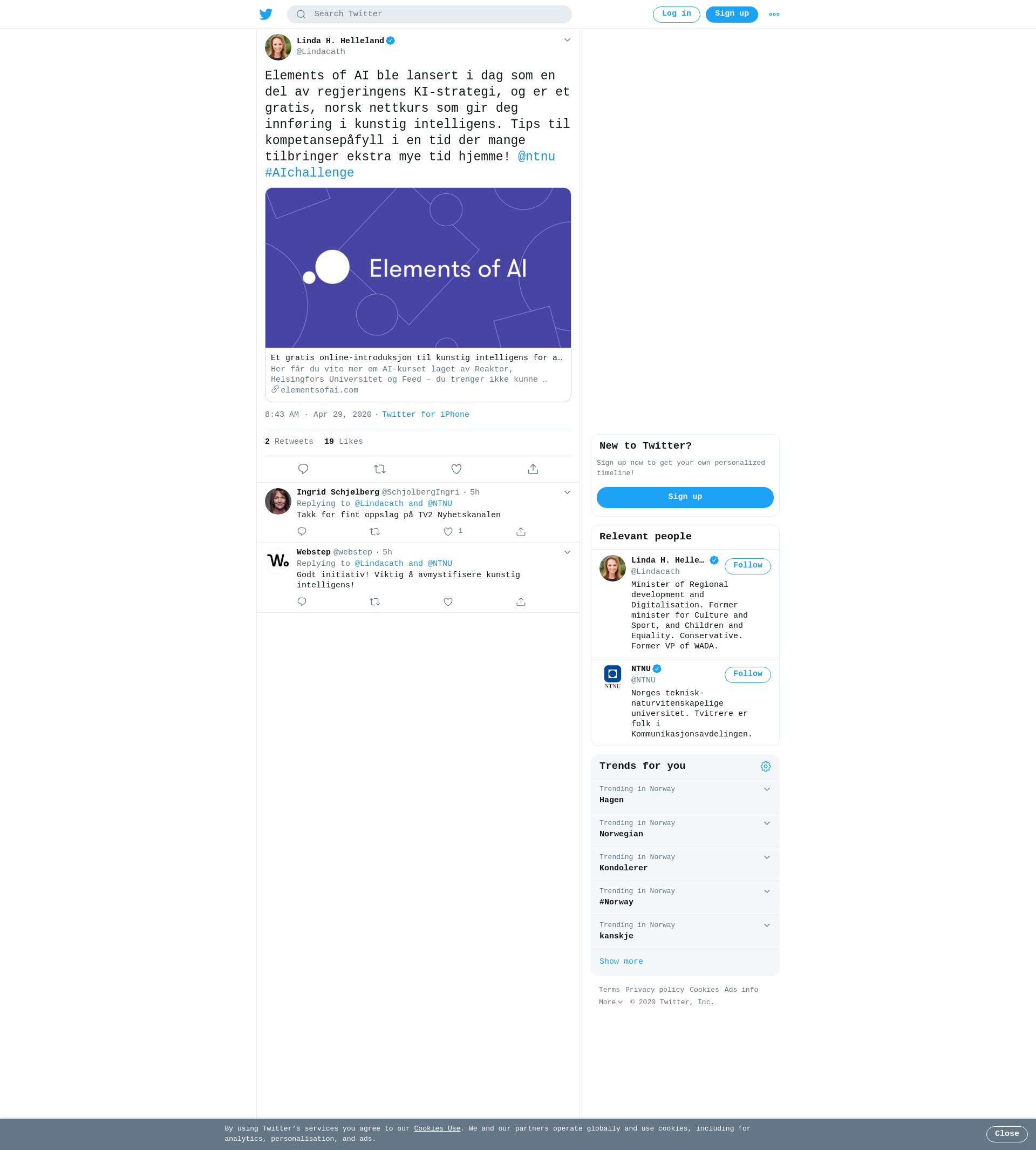 Elements of AI ble lansert i dag som en del av regjeringens KI-strategi, og er et gratis, norsk nettkurs som gir deg innføring i kunstig intelligens. Tips til kompetansepåfyll i en tid der mange tilbringer ekstra mye tid hjemme! @ntnu #AIchallenge