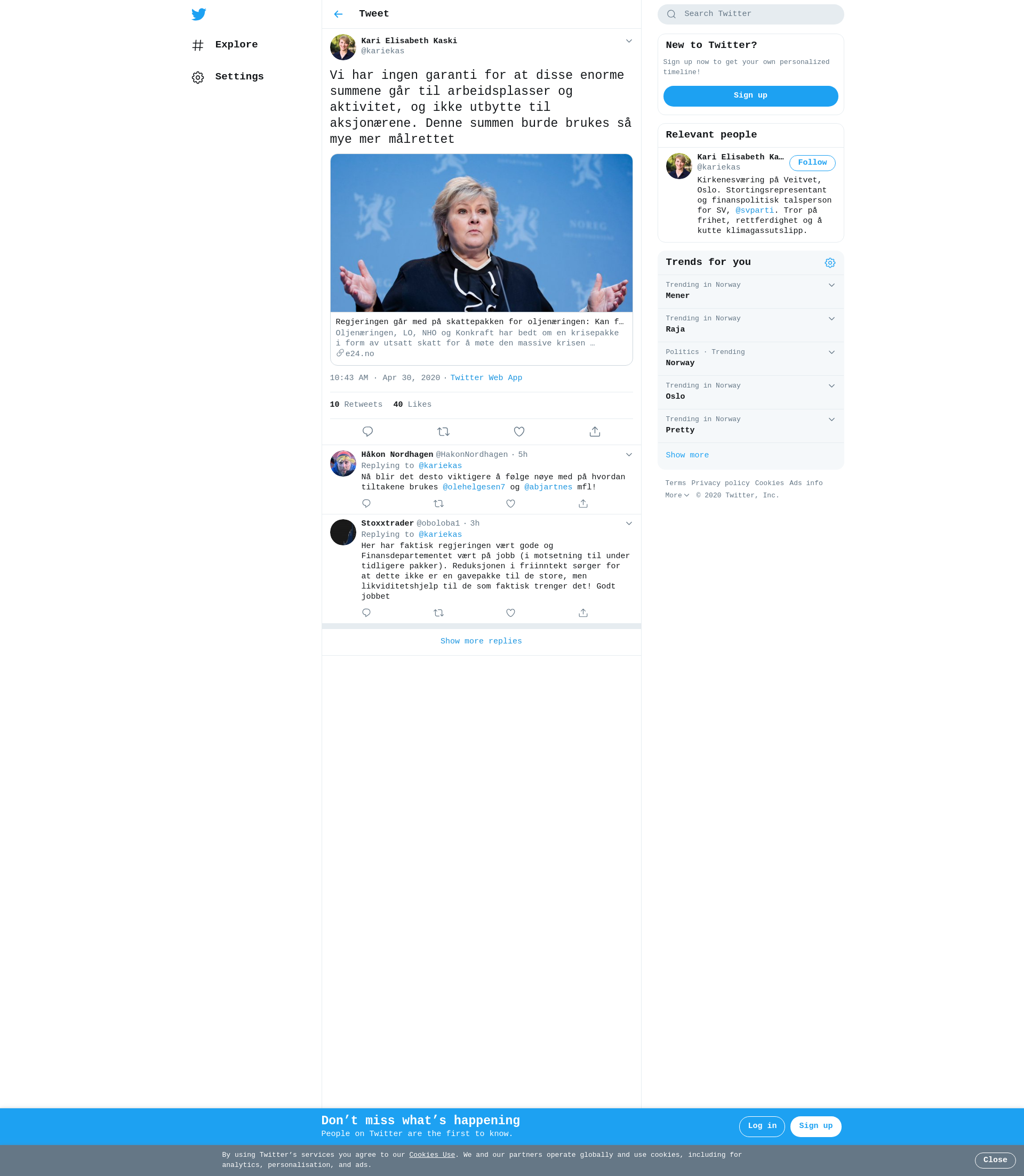 Oljenæringen, LO, NHO og Konkraft har bedt om en krisepakke i form av utsatt skatt for å møte den massive krisen oljenæringen står midt oppe i. Den pakken går regjeringen nå med på, med et lite unntak.