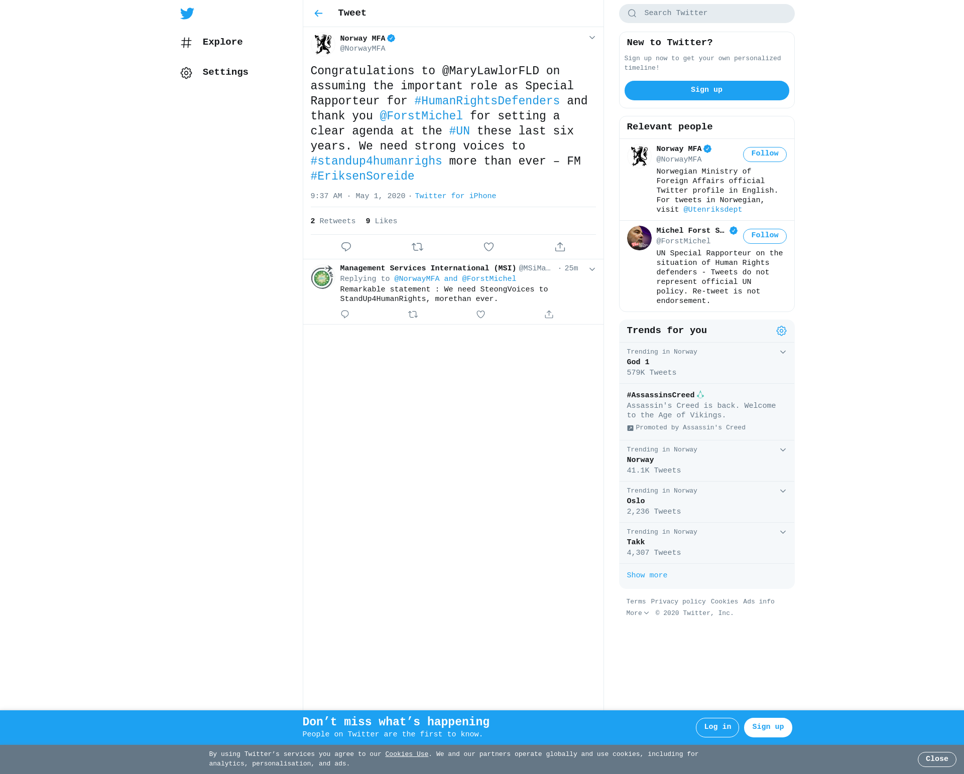 Congratulations to @MaryLawlorFLD on assuming the important role as Special Rapporteur for #HumanRightsDefenders and thank you @ForstMichel for setting a clear agenda at the #UN these last six years. We need strong voices to #standup4humanrighs more than ever – FM #EriksenSoreide