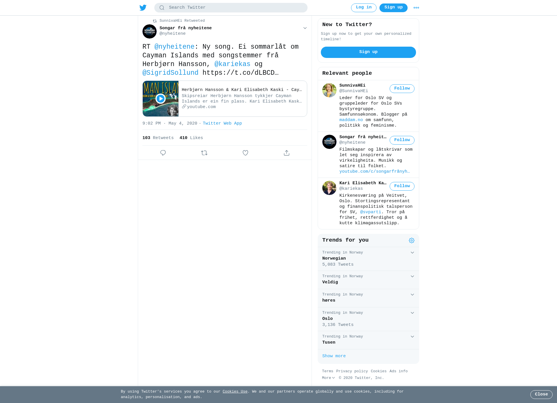 RT @nyheitene: Ny song. Ei sommarlåt om Cayman Islands med songstemmer frå Herbjørn Hansson, @kariekas og @SigridSollund https://t.co/dLBCDlaDf0