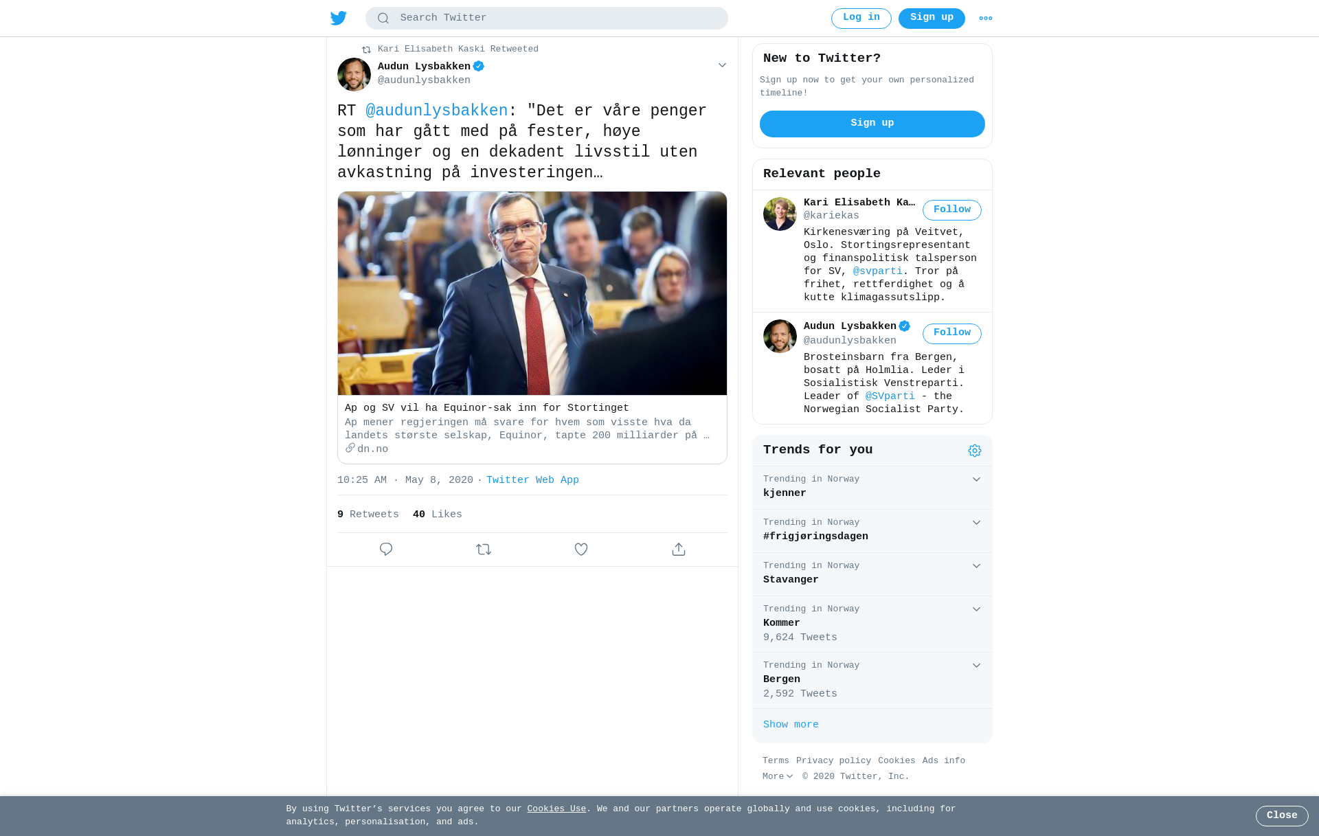 RT @audunlysbakken: "Det er våre penger som har gått med på fester, høye lønninger og en dekadent livsstil uten avkastning på investeringen (...)", sier @kariekas om Equinor-skandalen. https://t.co/l5kGuEa1oO