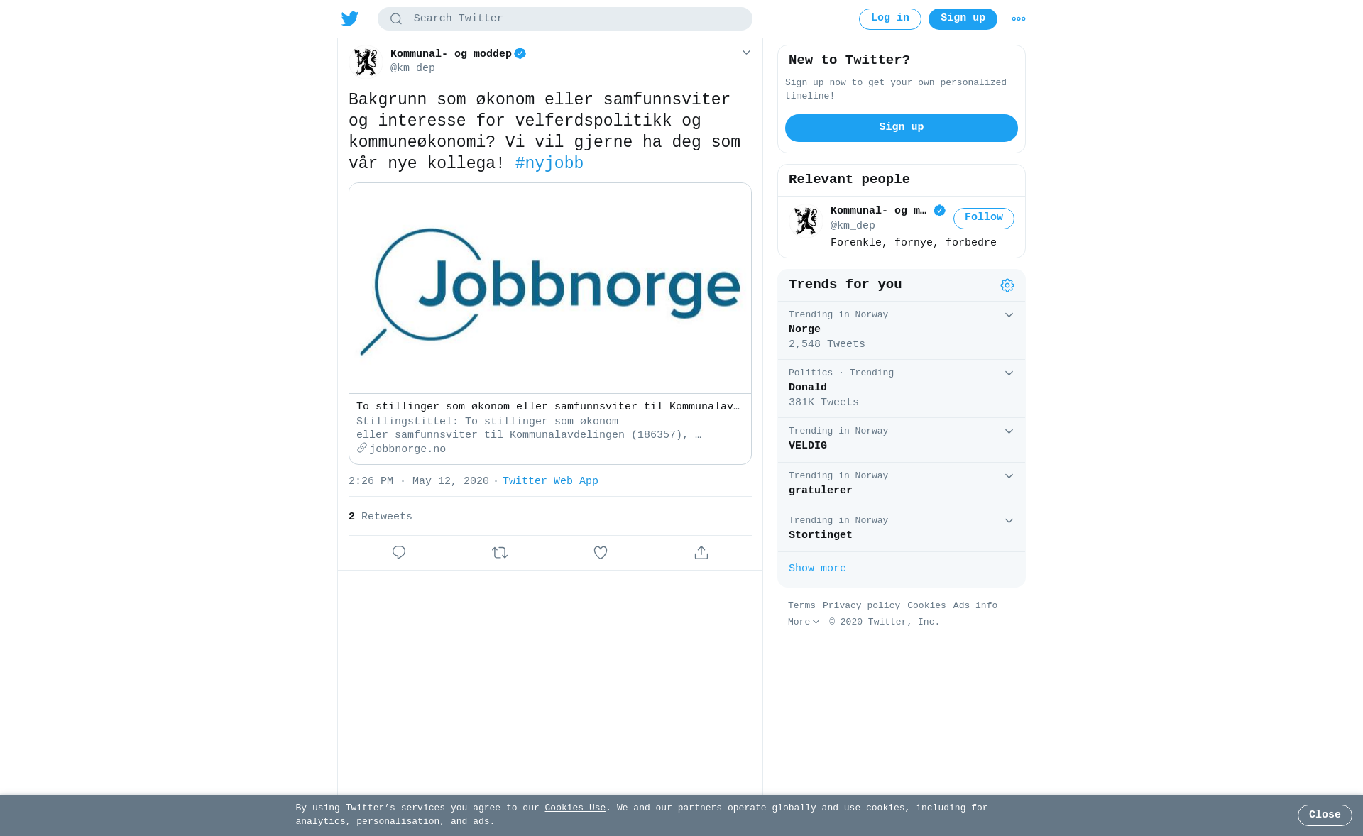 Stillingstittel: To stillinger som økonom eller samfunnsviter til Kommunalavdelingen (186357), Arbeidsgiver: Kommunal- og moderniseringsdepartementet, Søknadsfrist: 24. mai 2020