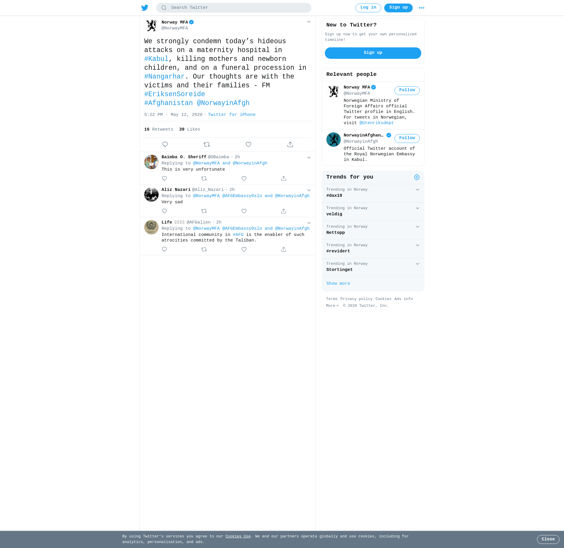 We strongly condemn today’s hideous attacks on a maternity hospital in #Kabul, killing mothers and newborn children, and on a funeral procession in #Nangarhar. Our thoughts are with the victims and their families - FM #EriksenSoreide