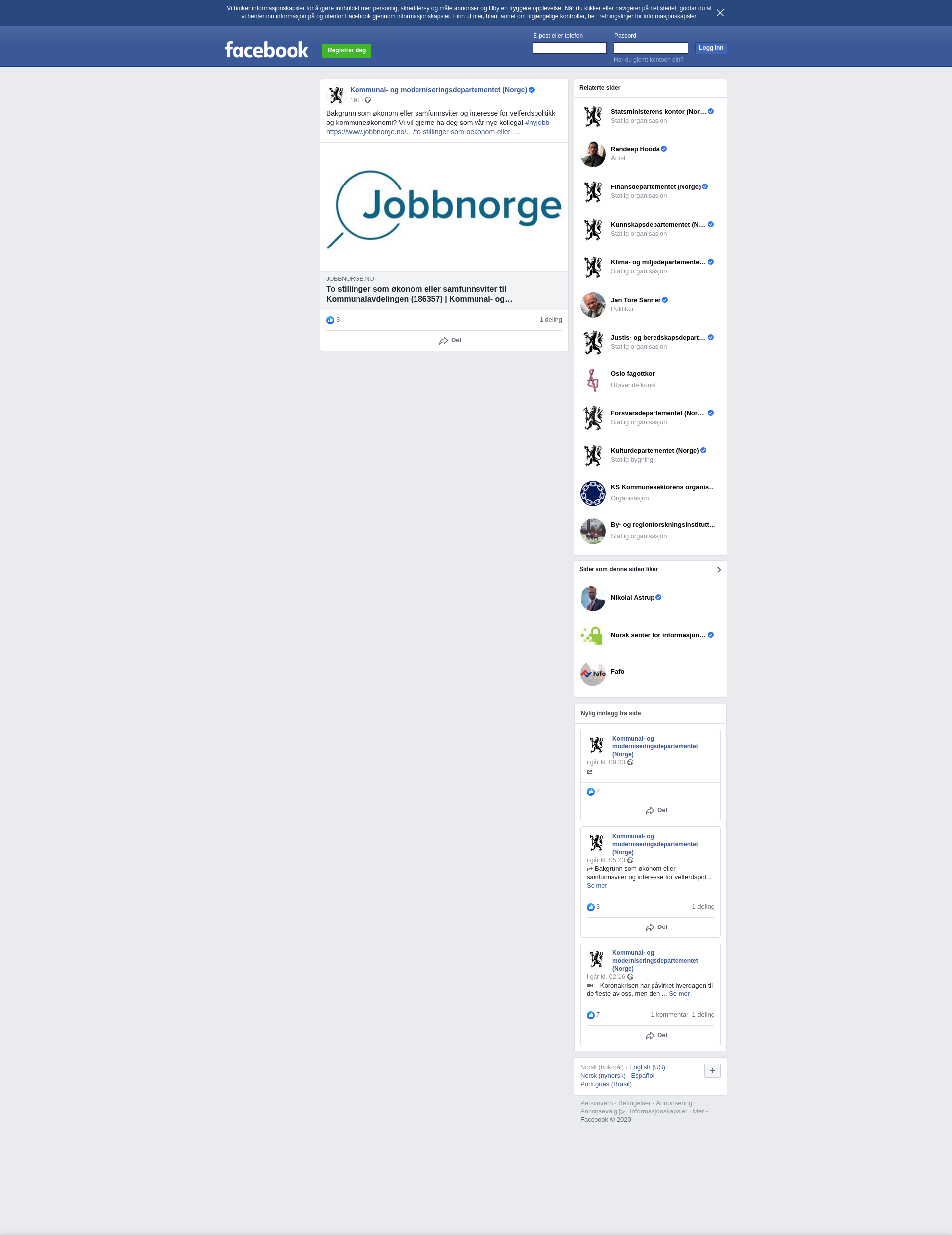 Stillingstittel: To stillinger som økonom eller samfunnsviter til Kommunalavdelingen (186357), Arbeidsgiver: Kommunal- og moderniseringsdepartementet, Søknadsfrist: 24. mai 2020