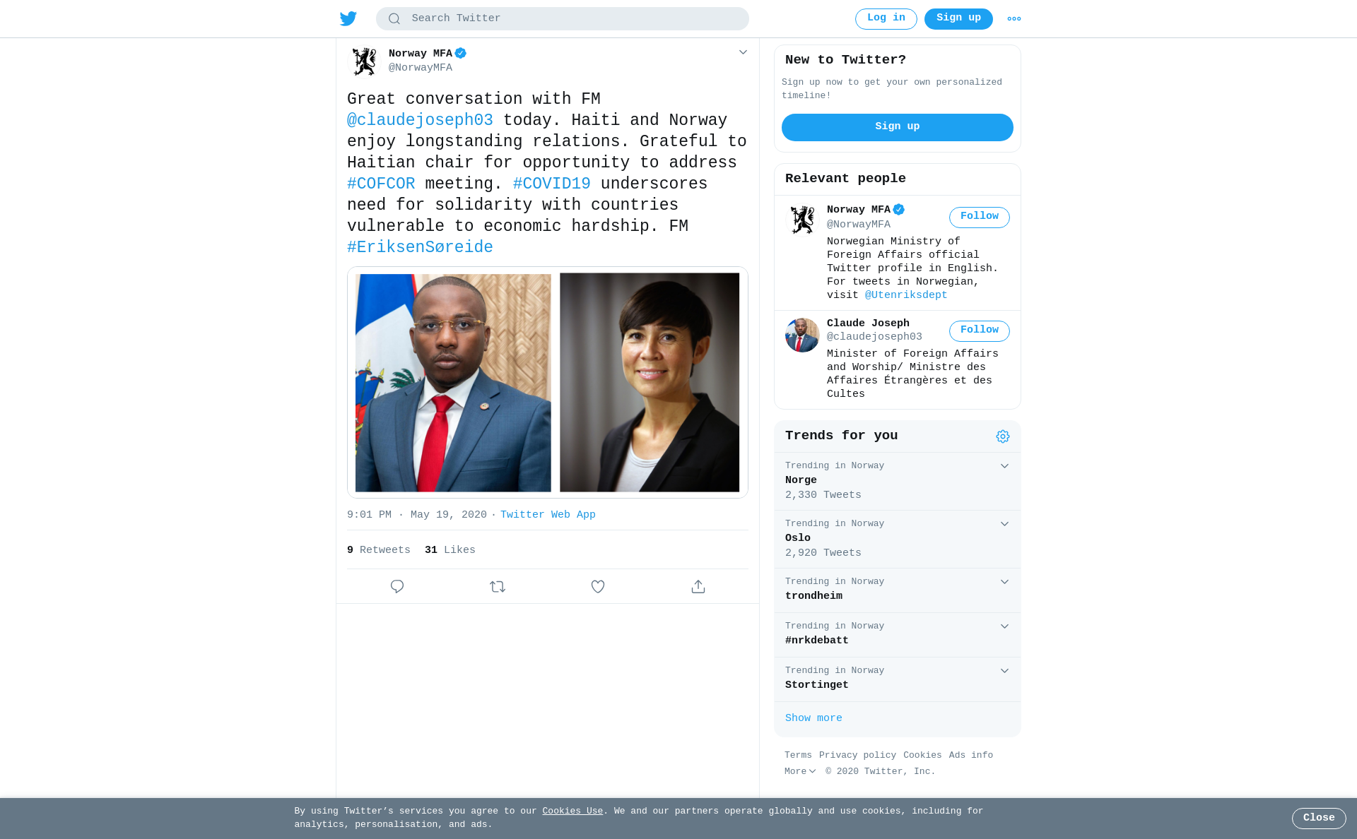 Great conversation with FM @claudejoseph03 today. Haiti and Norway enjoy longstanding relations. Grateful to Haitian chair for opportunity to address #COFCOR meeting. #COVID19 underscores need for solidarity with countries vulnerable to economic hardship. FM #EriksenSøreide https://t.co/pmOzUcl3lz