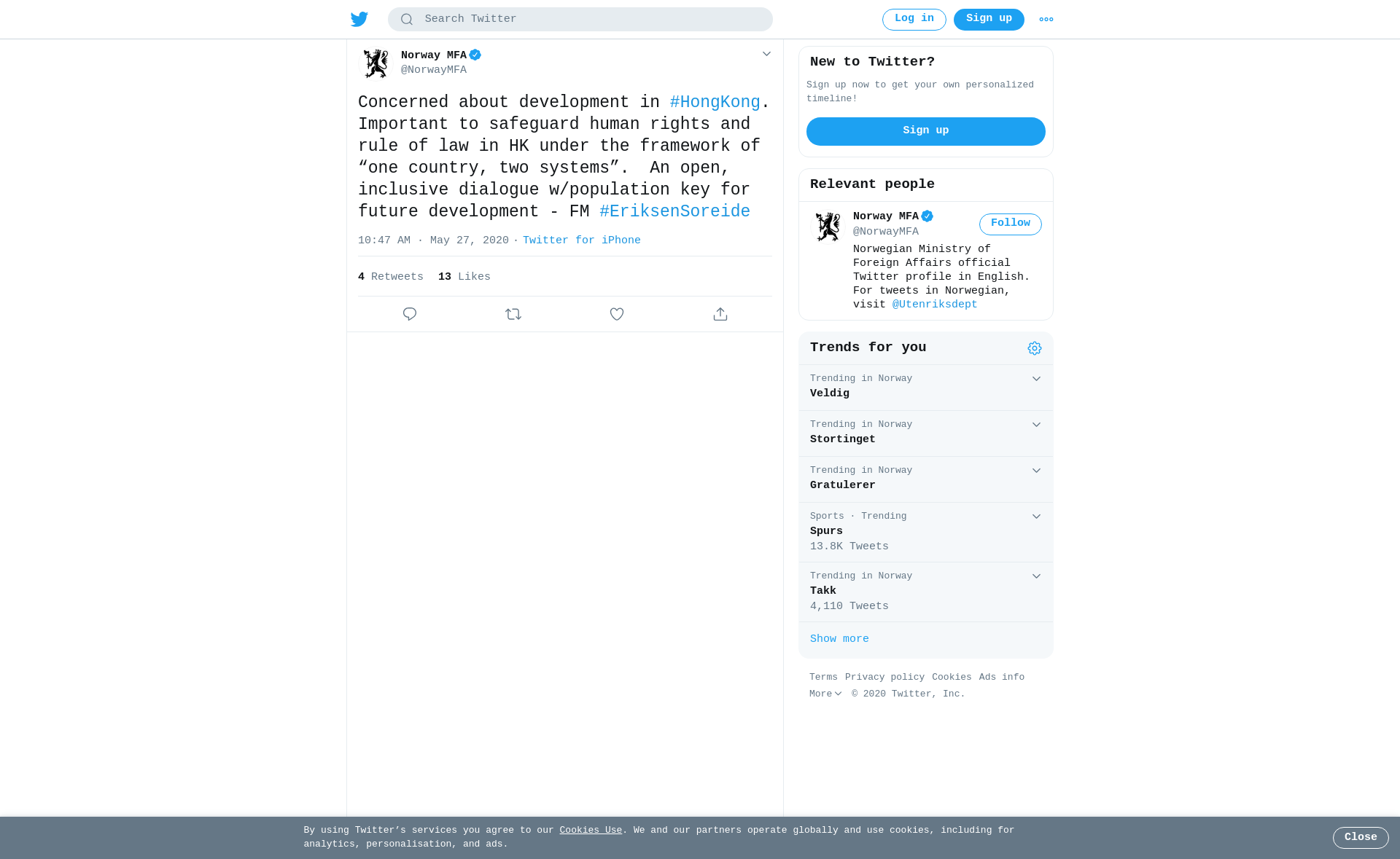 Concerned about development in #HongKong. Important to safeguard human rights and rule of law in HK under the framework of “one country, two systems”. An open, inclusive dialogue w/population key for future development - FM #EriksenSoreide