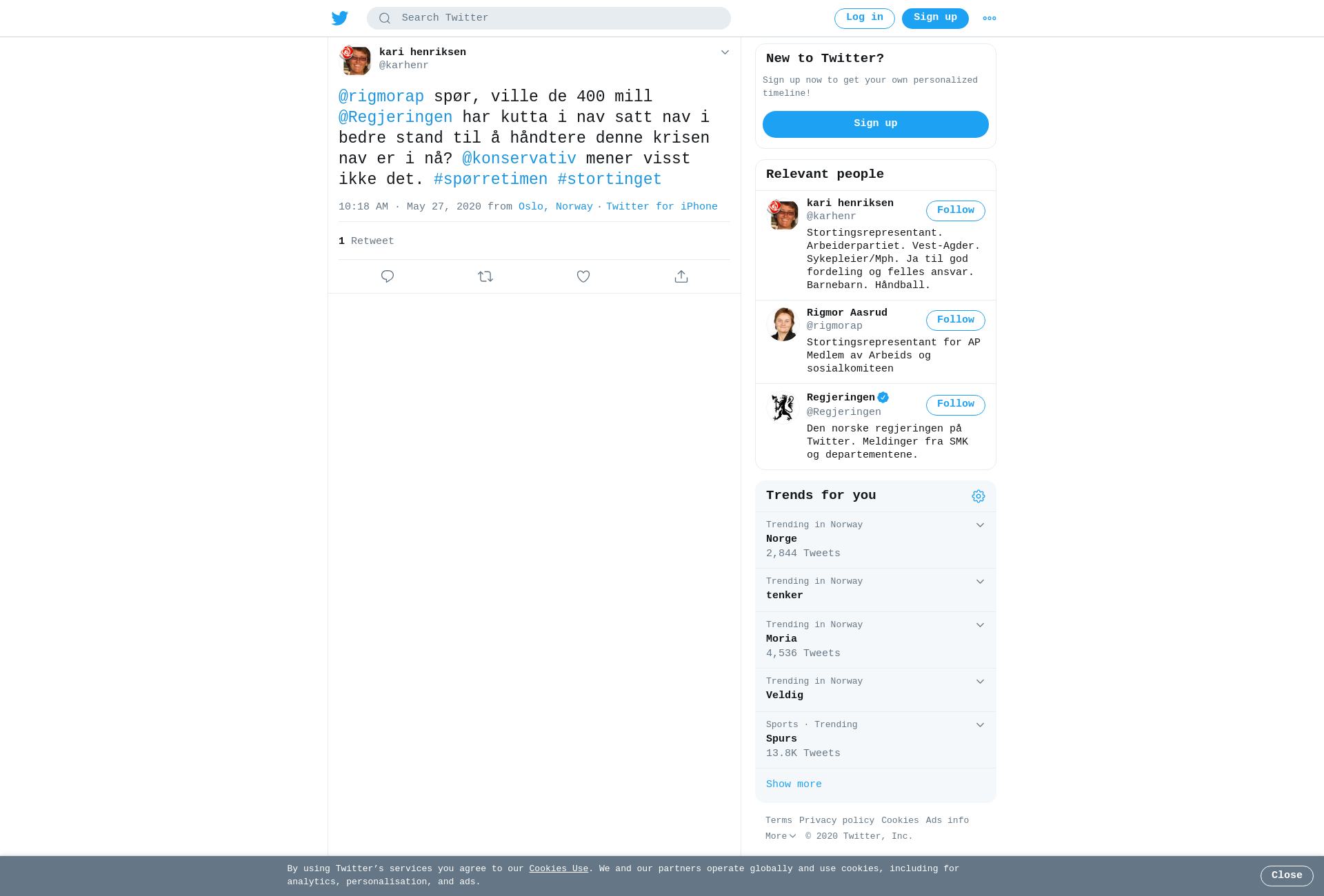 @rigmorap spør, ville de 400 mill @Regjeringen har kutta i nav satt nav i bedre stand til å håndtere denne krisen nav er i nå? @konservativ mener visst ikke det. #spørretimen #stortinget