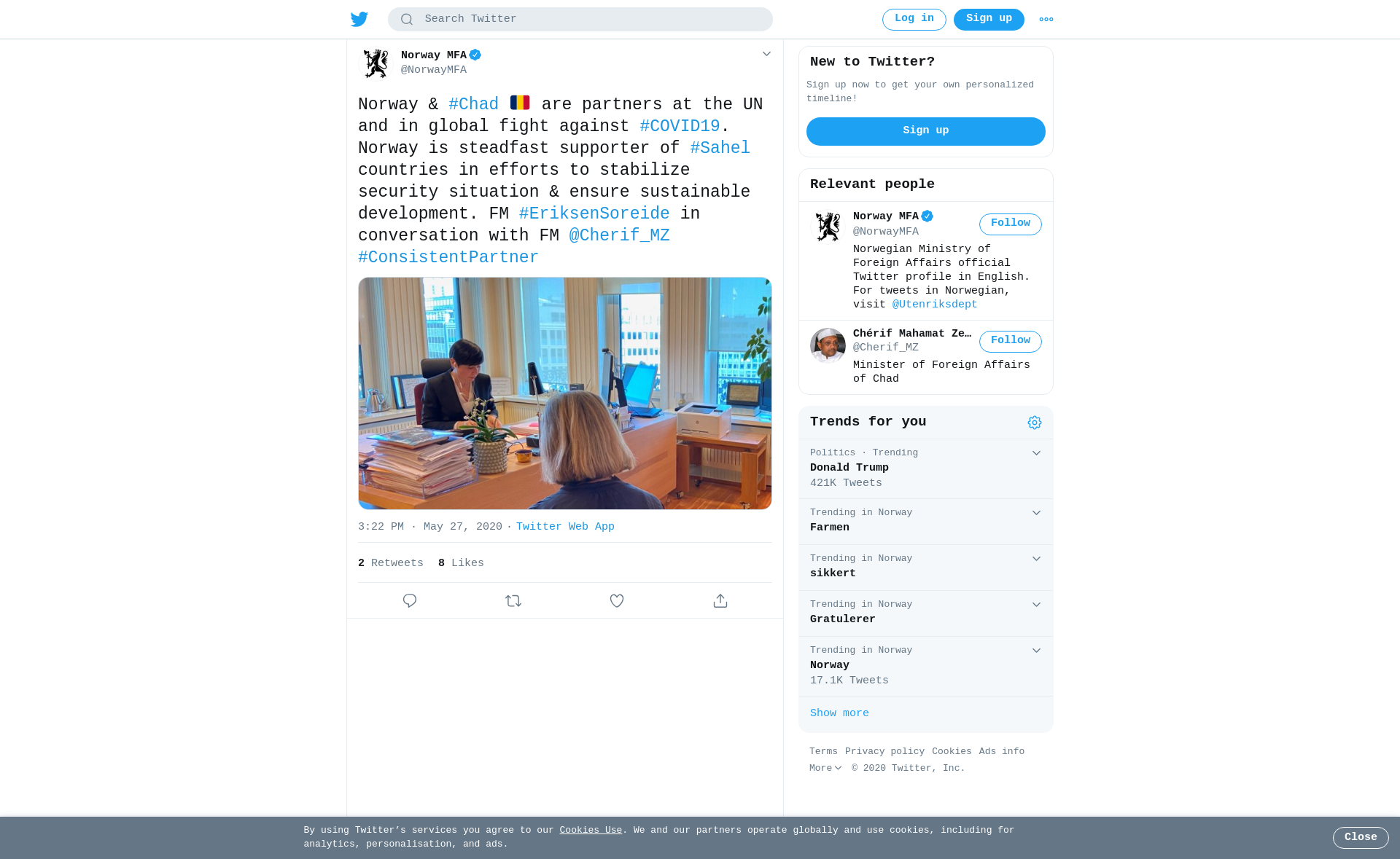 Norway & #Chad 🇹🇩 are partners at the UN and in global fight against #COVID19. Norway is steadfast supporter of #Sahel countries in efforts to stabilize security situation & ensure sustainable development. FM #EriksenSoreide in conversation with FM @Cherif_MZ #ConsistentPartner https://t.co/Ck7yi2rtVy