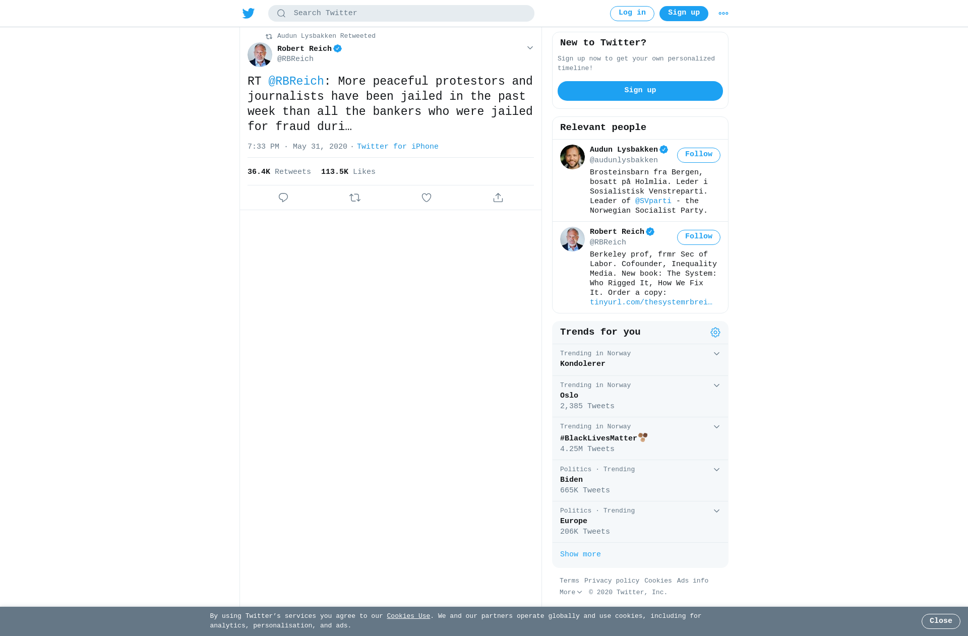 RT @RBReich: More peaceful protestors and journalists have been jailed in the past week than all the bankers who were jailed for fraud during the financial collapse.