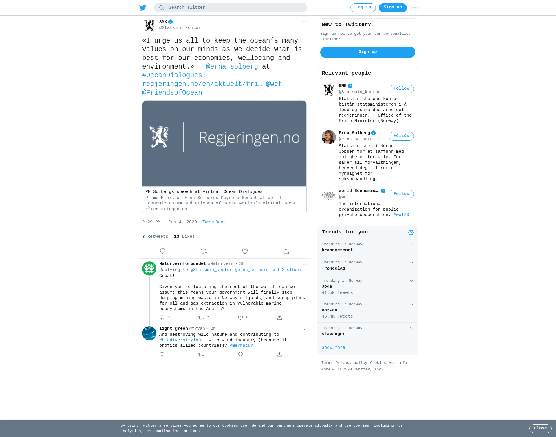 «I urge us all to keep the ocean’s many values on our minds as we decide what is best for our economies, wellbeing and environment.» - @erna_solberg at #OceanDialogues: https://t.co/RLvsZrxLWv @wef @FriendsofOcean