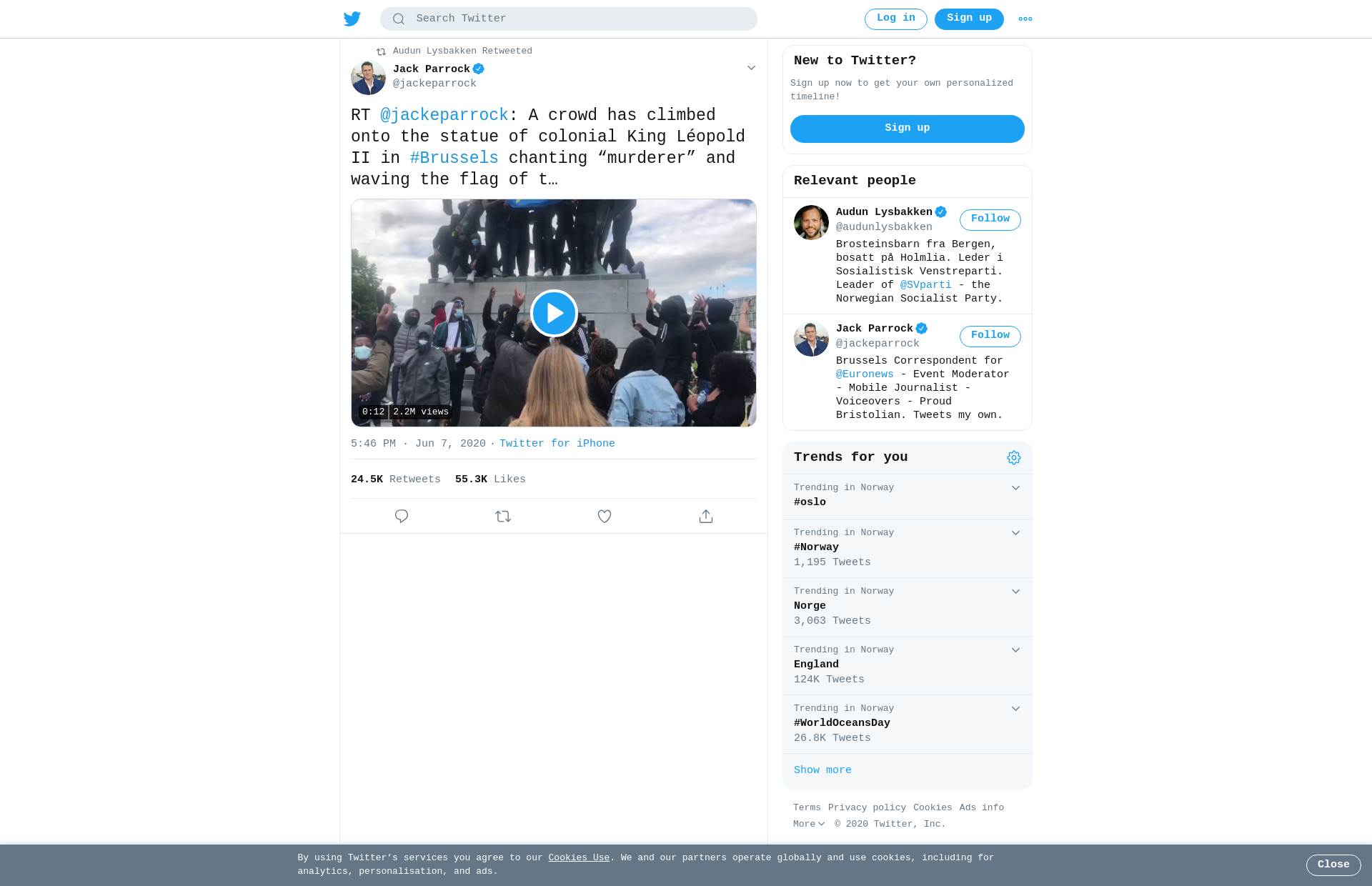 RT @jackeparrock: A crowd has climbed onto the statue of colonial King Léopold II in #Brussels chanting “murderer” and waving the flag of the Democratic Republic of Congo where his atrocities took place. #DRC 🇨🇩 #BlackLivesMatter https://t.co/DIH9MGu39M