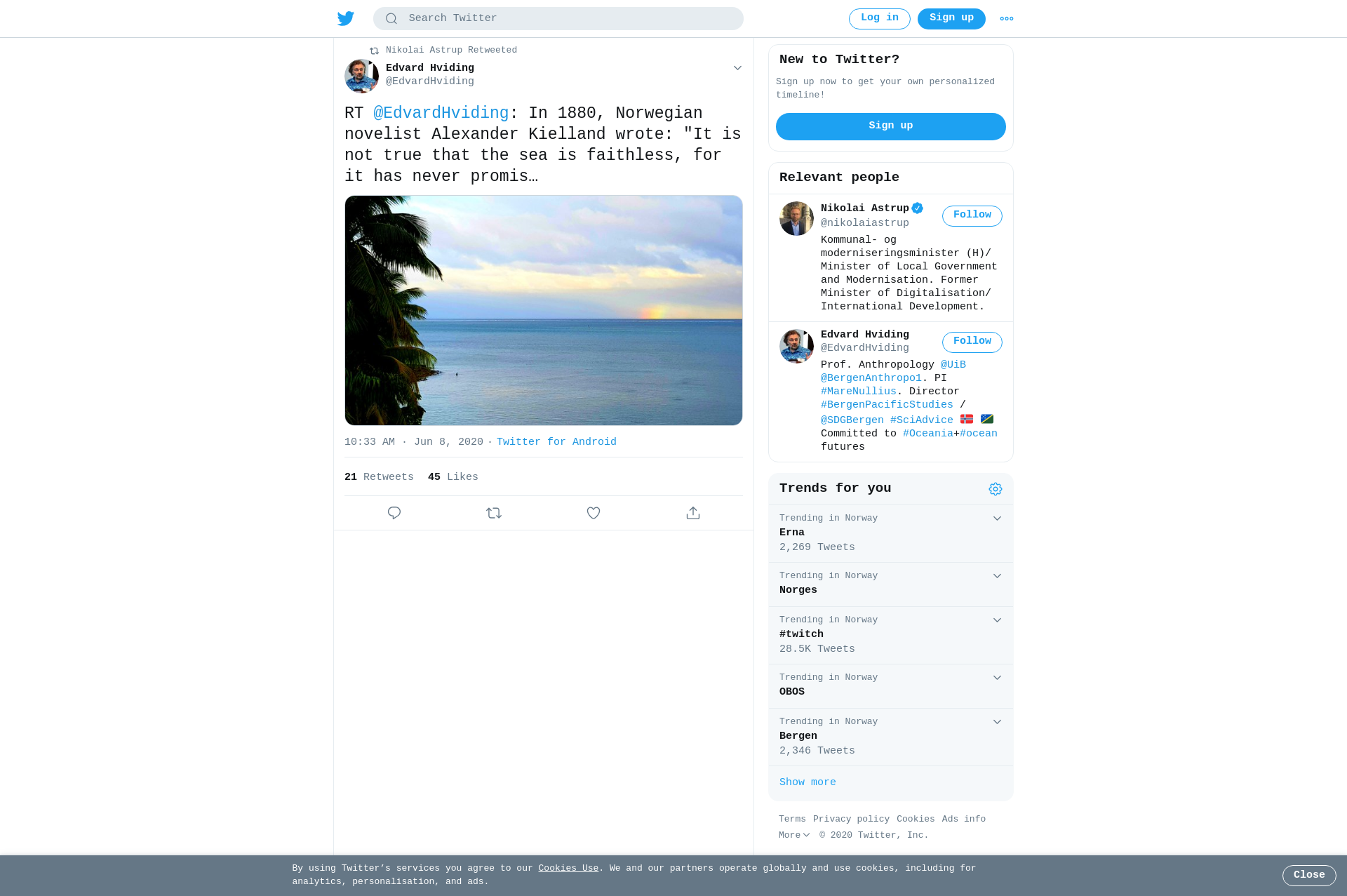 RT @EdvardHviding: In 1880, Norwegian novelist Alexander Kielland wrote: "It is not true that the sea is faithless, for it has never promised anything; without claim, without obligation, free, pure, and genuine beats the mighty heart, the last sound one in an ailing world". #WorldOceanDay https://t.co/2gBQFHkiT4