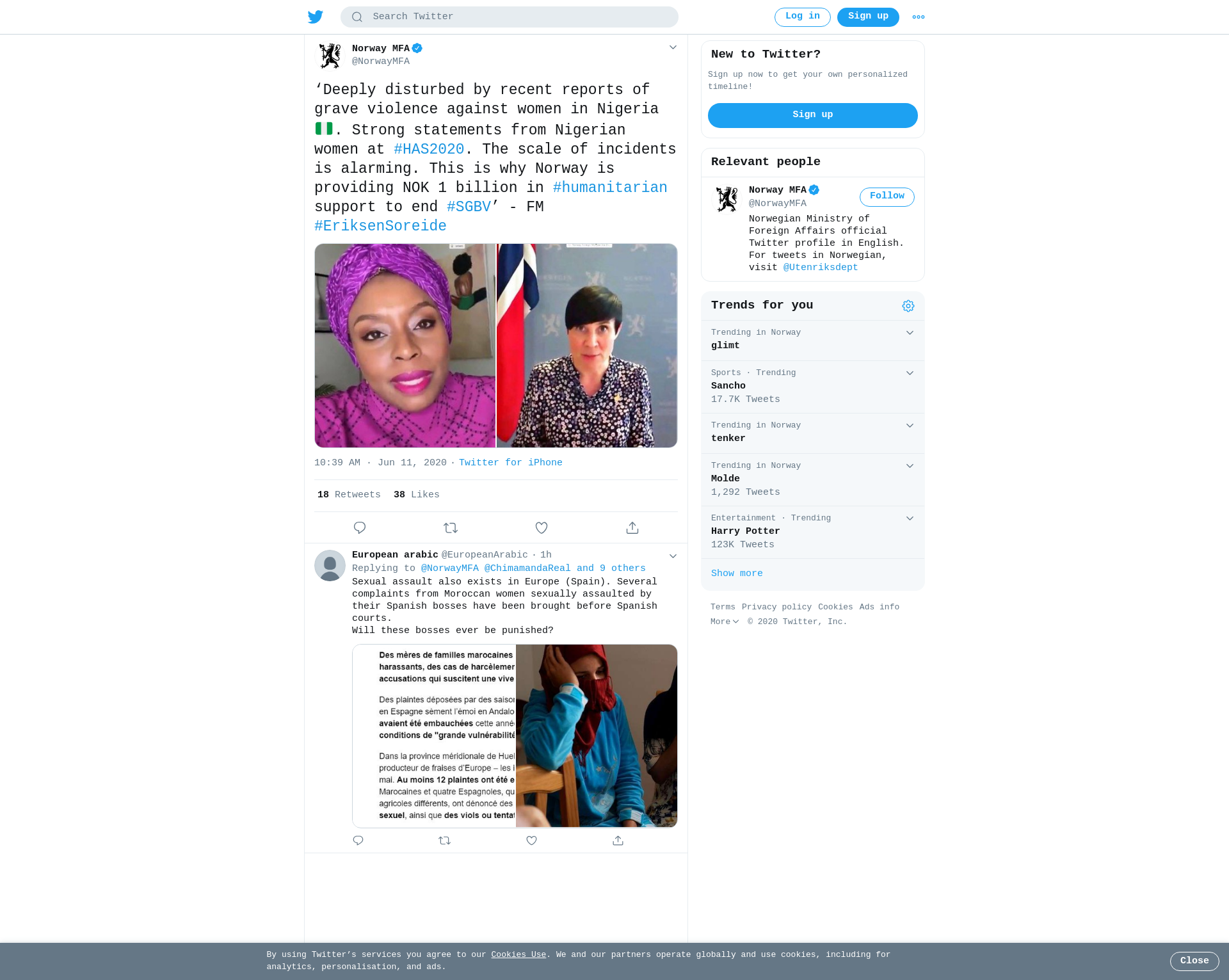 ‘Deeply disturbed by recent reports of grave violence against women in Nigeria 🇳🇬. Strong statements from Nigerian women at #HAS2020. The scale of incidents is alarming. This is why Norway is providing NOK 1 billion in #humanitarian support to end #SGBV’ - FM #EriksenSoreide https://t.co/dsw0a47VuO