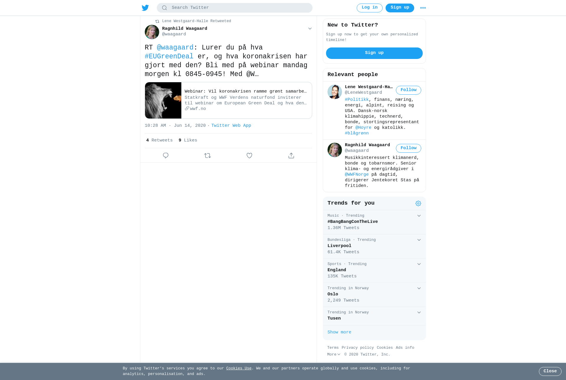 RT @waagaard: Lurer du på hva #EUGreenDeal er, og hva koronakrisen har gjort med den? Bli med på webinar mandag morgen kl 0845-0945! Med @WWFNorge, @StatkraftAS, @BjornKHaugland, @LeneWestgaard, @EspenBarthEide @Haltbrekken @NielsFuglsang @JWedege @Karoline_Andaur. https://t.co/glF36OrStS