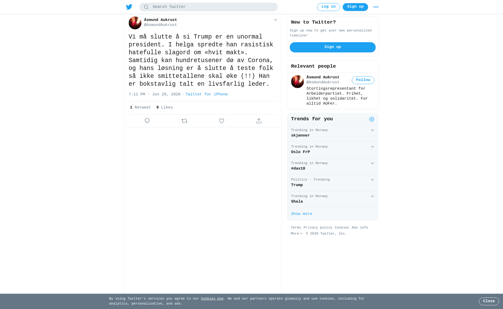 Vi må slutte å si Trump er en unormal president. I helga spredte han rasistisk hatefulle slagord om «hvit makt». Samtidig kan hundretusener dø av Corona, og hans løsning er å slutte å teste folk så ikke smittetallene skal øke (!!) Han er bokstavlig talt en livsfarlig leder.