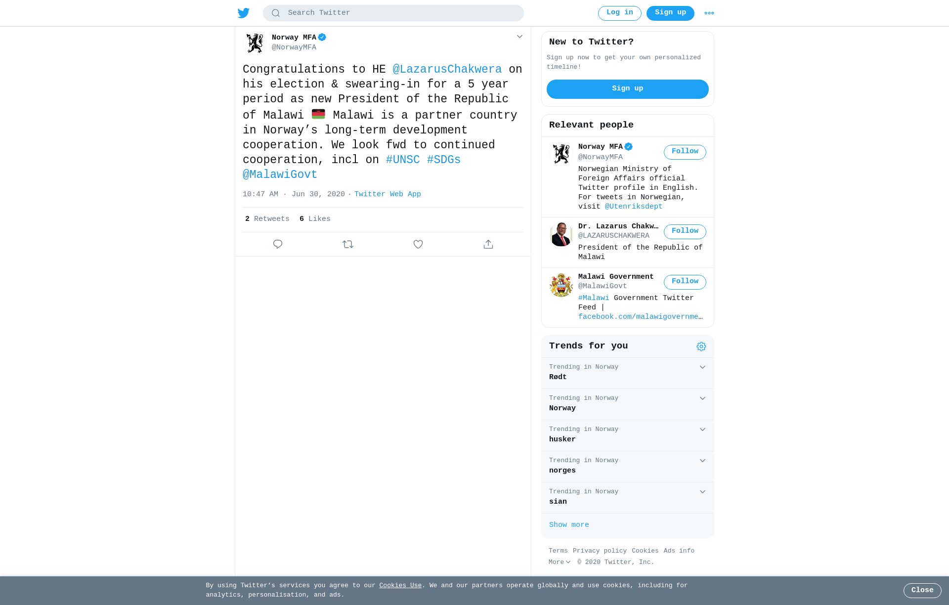 Congratulations to HE @LazarusChakwera on his election & swearing-in for a 5 year period as new President of the Republic of Malawi 🇲🇼 Malawi is a partner country in Norway’s long-term development cooperation. We look fwd to continued cooperation, incl on #UNSC #SDGs @MalawiGovt