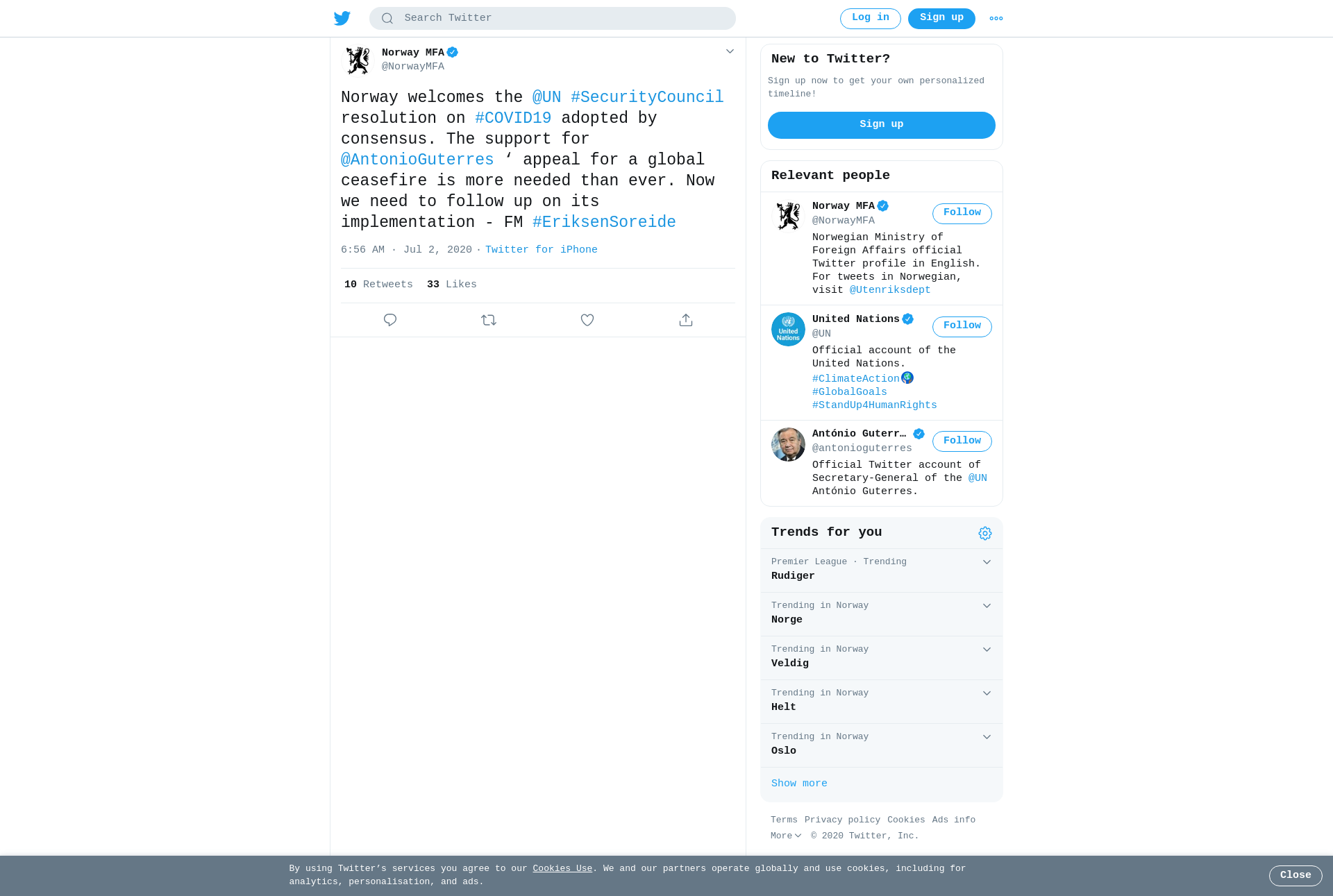 Norway welcomes the @UN #SecurityCouncil resolution on #COVID19 adopted by consensus. The support for @AntonioGuterres ‘ appeal for a global ceasefire is more needed than ever. Now we need to follow up on its implementation - FM #EriksenSoreide