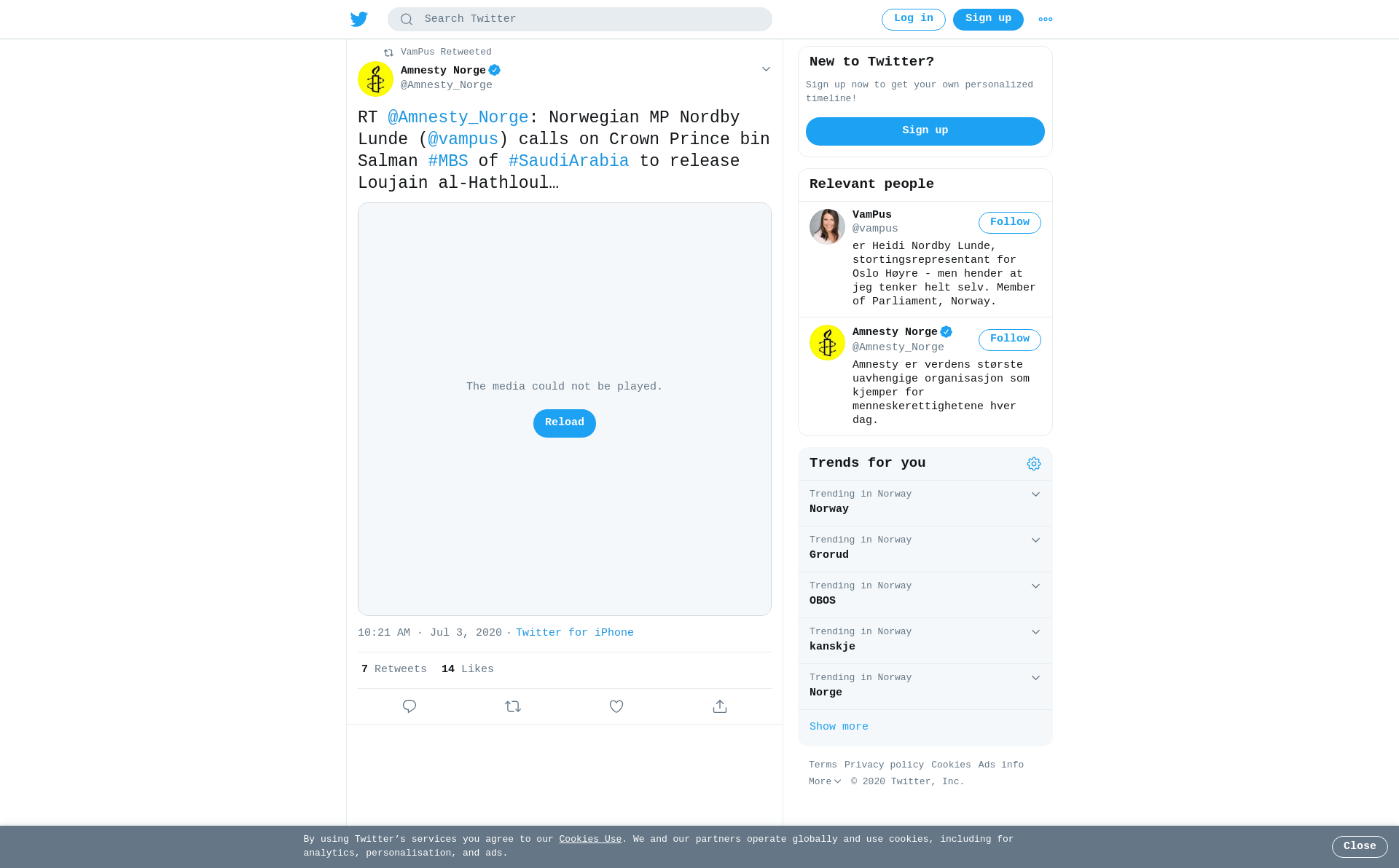 RT @Amnesty_Norge: Norwegian MP Nordby Lunde (@vampus) calls on Crown Prince bin Salman #MBS of #SaudiArabia to release Loujain al-Hathloul & Nassima al-Saada before the #G20SaudiArabia. Along with @SV_Karin & @kariekas she has nominated the women’s rights activists for the #NobelPeacePrize. 🇸🇦 https://t.co/zaFzJ3jt7Y