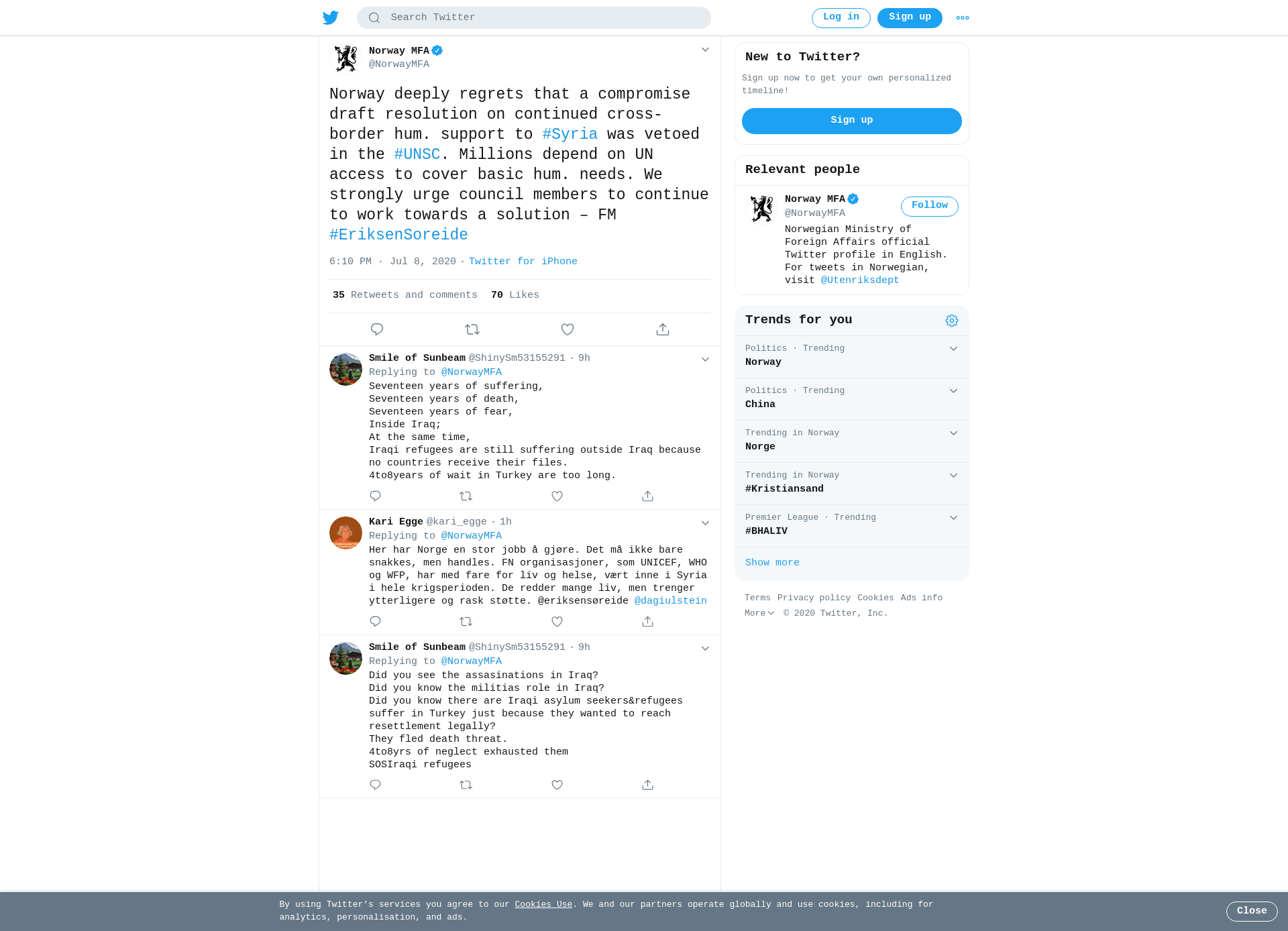 Norway deeply regrets that a compromise draft resolution on continued cross-border hum. support to #Syria was vetoed in the #UNSC. Millions depend on UN access to cover basic hum. needs. We strongly urge council members to continue to work towards a solution – FM #EriksenSoreide