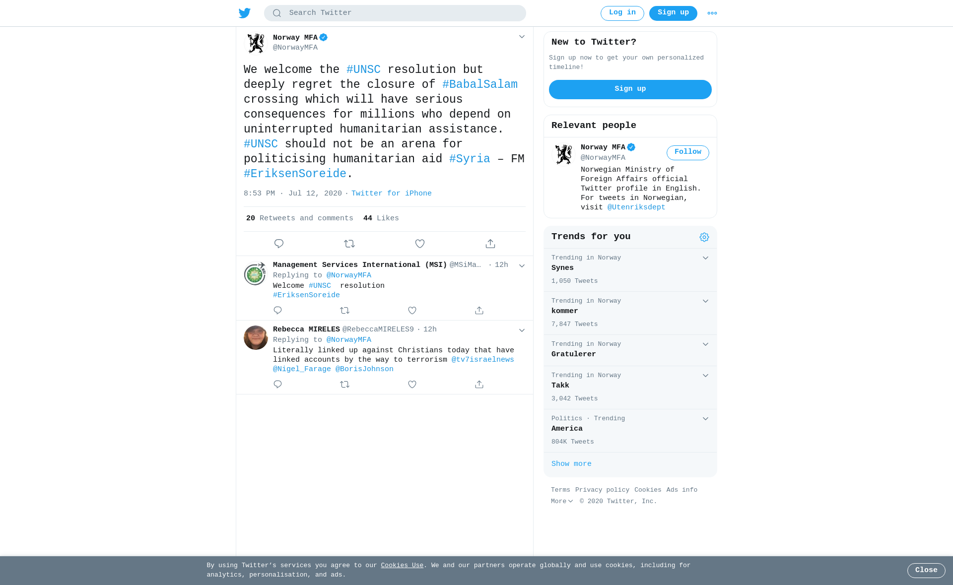 We welcome the #UNSC resolution but deeply regret the closure of #BabalSalam crossing which will have serious consequences for millions who depend on uninterrupted humanitarian assistance. #UNSC should not be an arena for politicising humanitarian aid #Syria – FM #EriksenSoreide.