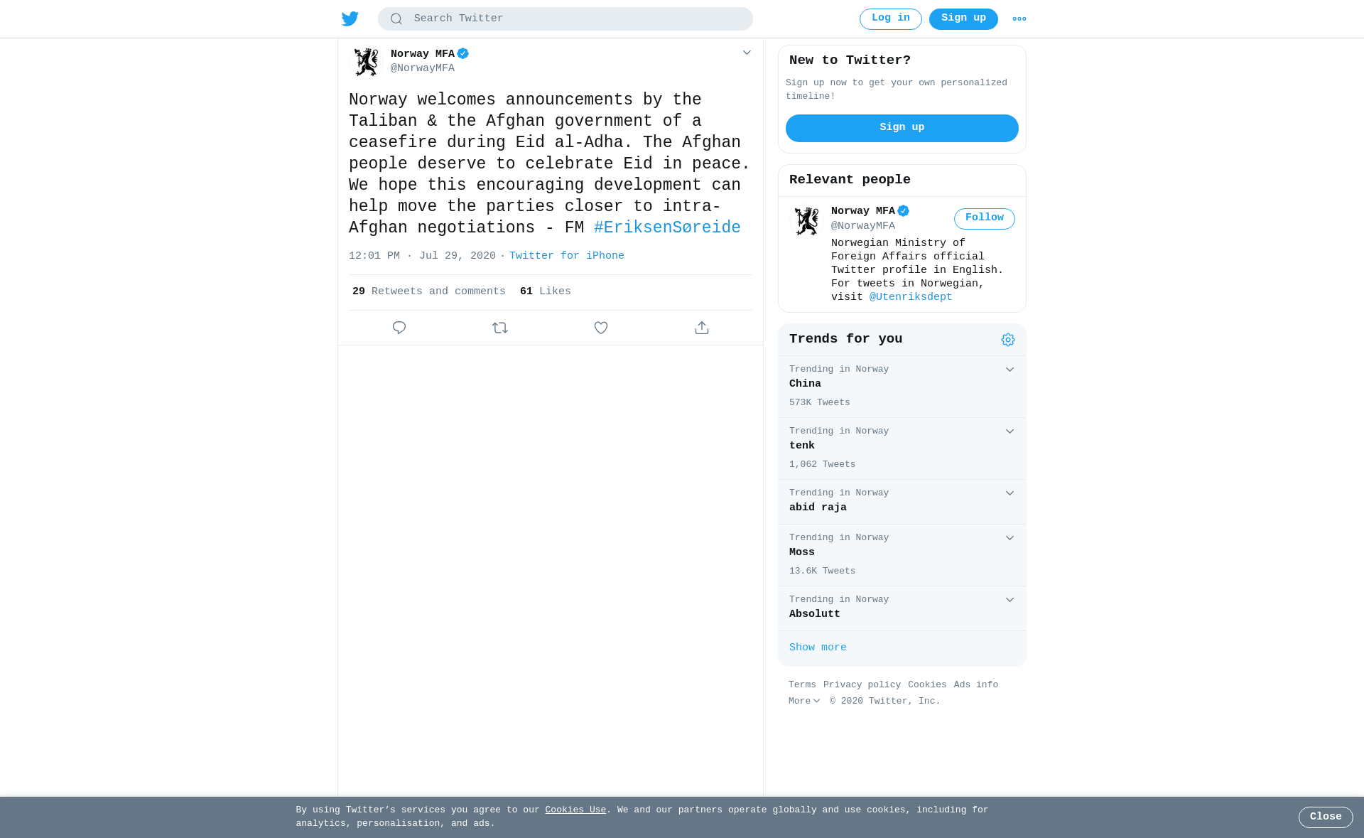 Norway welcomes announcements by the Taliban & the Afghan government of a ceasefire during Eid al-Adha. The Afghan people deserve to celebrate Eid in peace. We hope this encouraging development can help move the parties closer to intra-Afghan negotiations - FM #EriksenSøreide