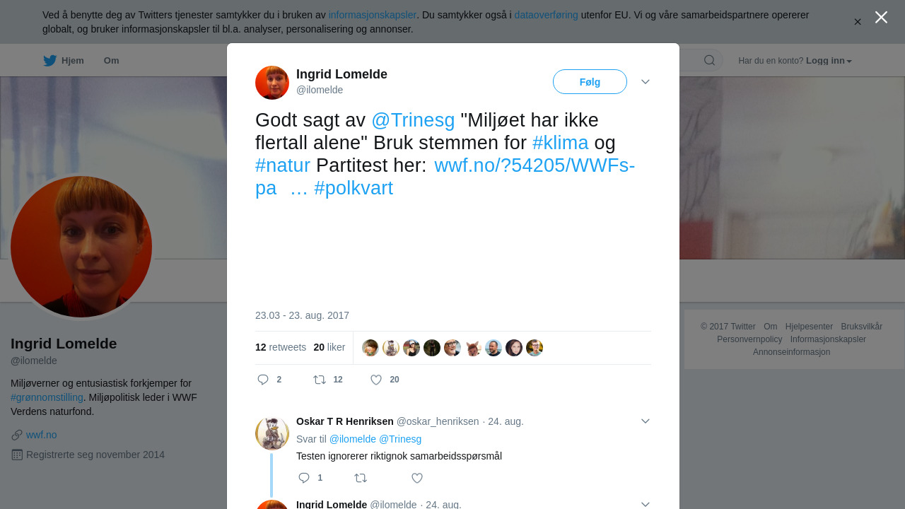 RT @ilomelde: Godt sagt av @Trinesg "Miljøet har ikke flertall alene" Bruk stemmen for #klima og #natur Partitest her: https://t.co/6F7v9X7WbB #polkvart
