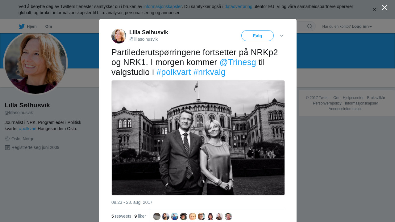 RT @lillasolhusvik: Partilederutspørringene fortsetter på NRKp2 og NRK1. I morgen kommer @Trinesg til valgstudio i #polkvart #nrkvalg https://t.co/pUSH4XXJGR
