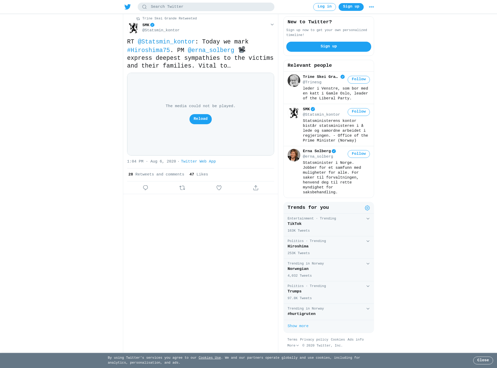 RT @Statsmin_kontor: Today we mark #Hiroshima75. PM @erna_solberg 📽 express deepest sympathies to the victims and their families. Vital to ensure continued global commitment to the Treaty on the Non-Proliferation of Nuclear Weapons #NPT https://t.co/ZeVah6UzUX