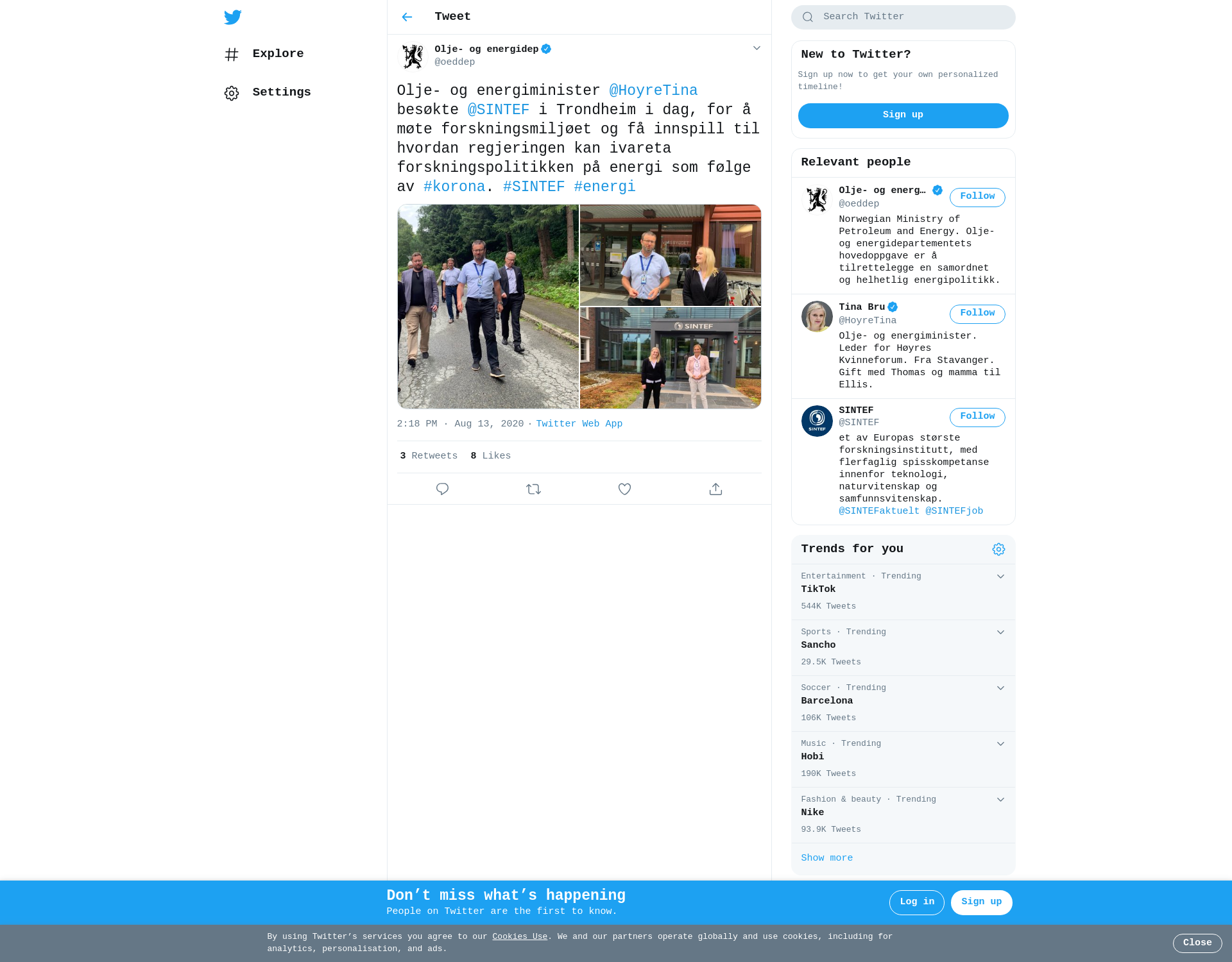 Olje- og energiminister @HoyreTina besøkte @SINTEF i Trondheim i dag, for å møte forskningsmiljøet og få innspill til hvordan regjeringen kan ivareta forskningspolitikken på energi som følge av #korona. #SINTEF #energi https://t.co/xYptJvIZLm