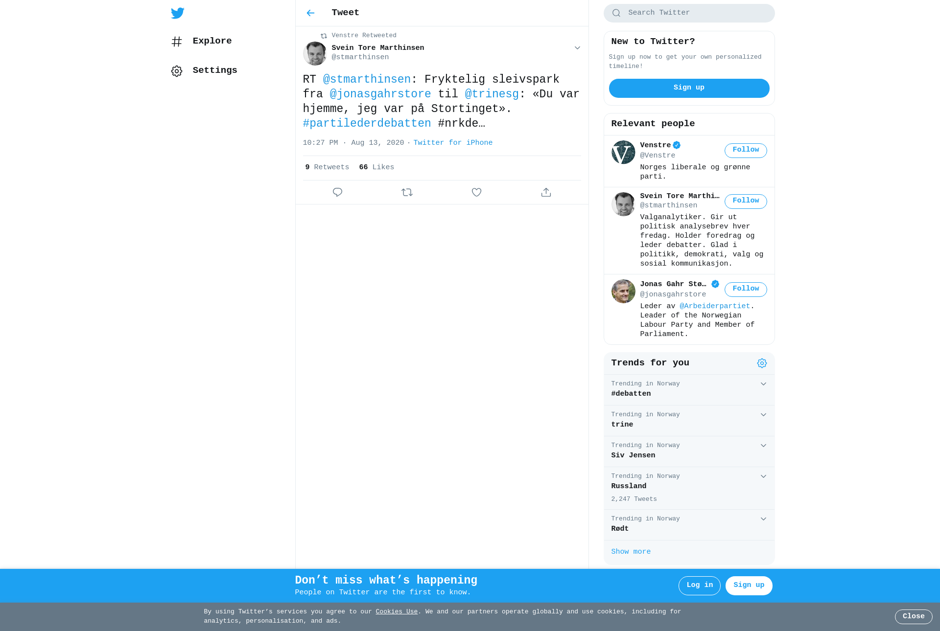 RT @stmarthinsen: Fryktelig sleivspark fra @jonasgahrstore til @trinesg: «Du var hjemme, jeg var på Stortinget». #partilederdebatten #nrkdebatt