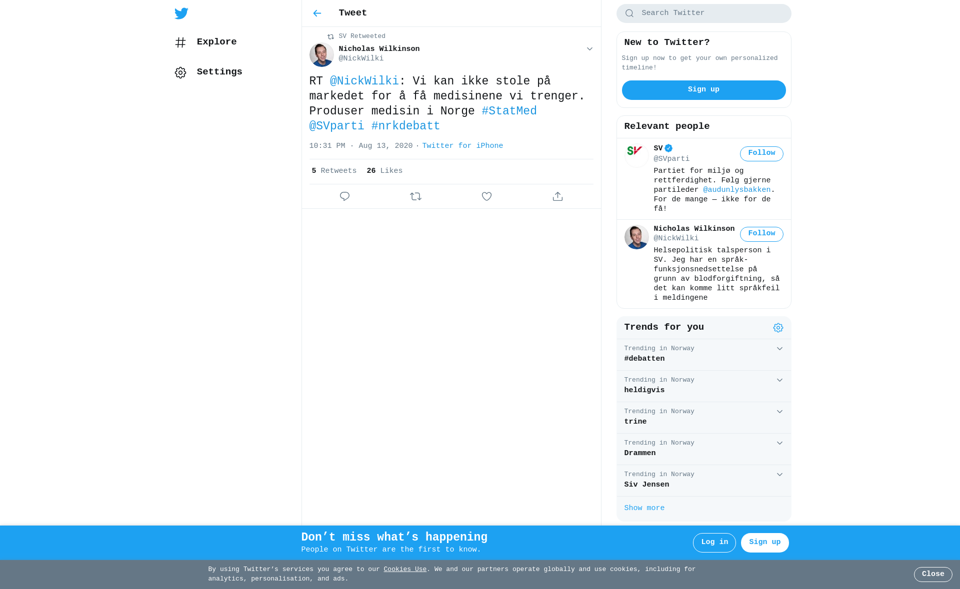 RT @NickWilki: Vi kan ikke stole på markedet for å få medisinene vi trenger. Produser medisin i Norge #StatMed @SVparti #nrkdebatt