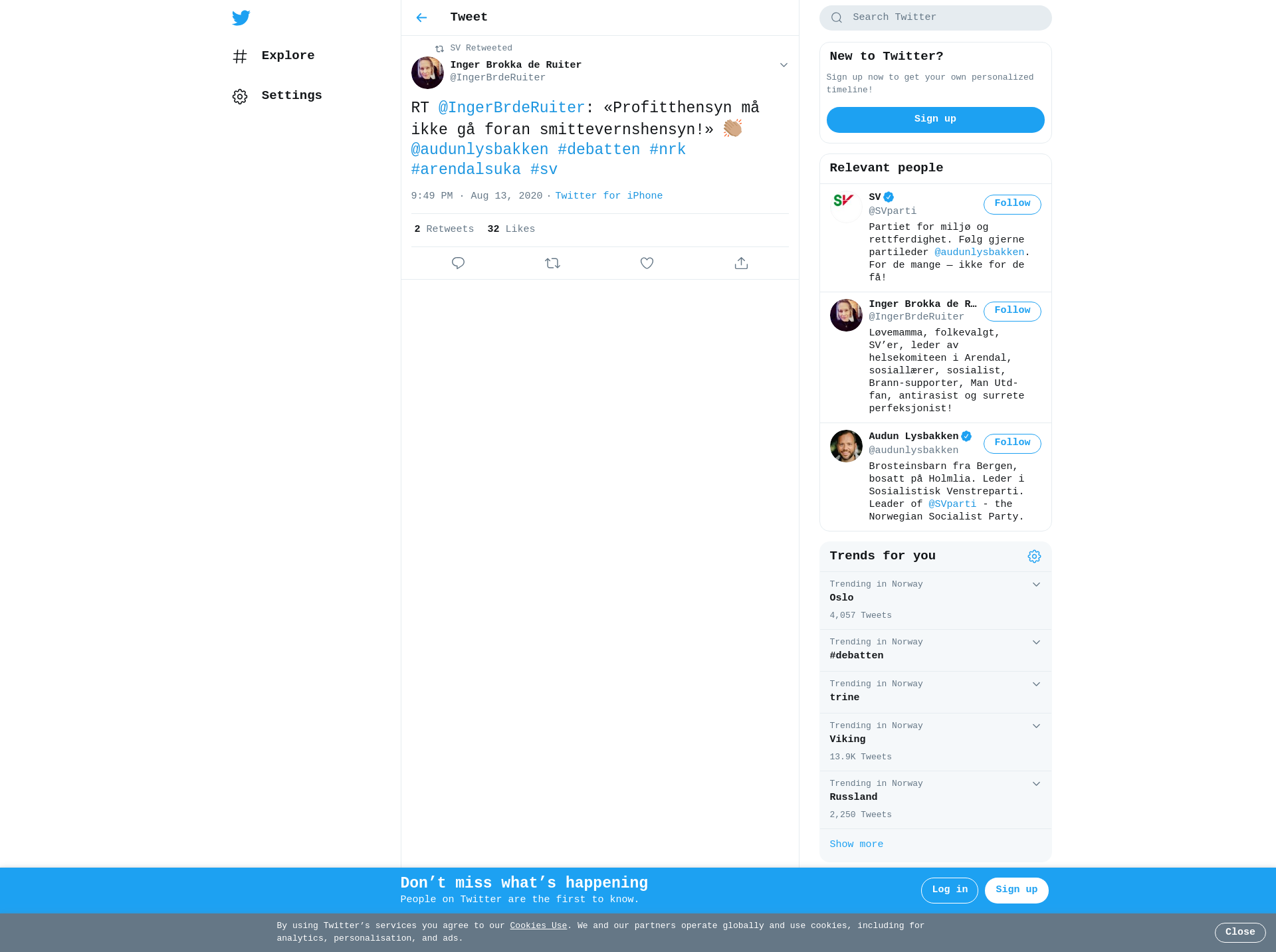 RT @IngerBrdeRuiter: «Profitthensyn må ikke gå foran smittevernshensyn!» 👏🏽 @audunlysbakken #debatten #nrk #arendalsuka #sv