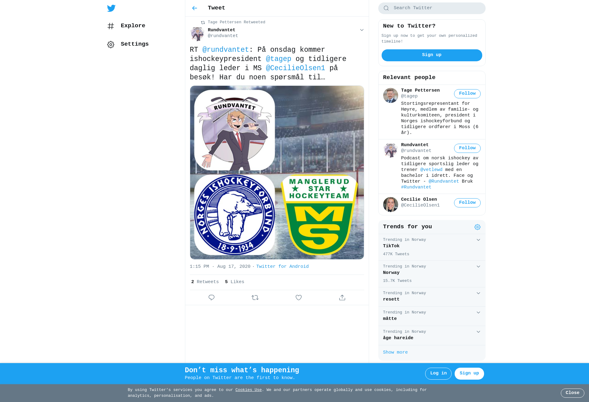 RT @rundvantet: På onsdag kommer ishockeypresident @tagep og tidligere daglig leder i MS @CecilieOlsen1 på besøk! Har du noen spørsmål til duoen? #2hockey #rundvantet https://t.co/c7y4dJ6CQQ