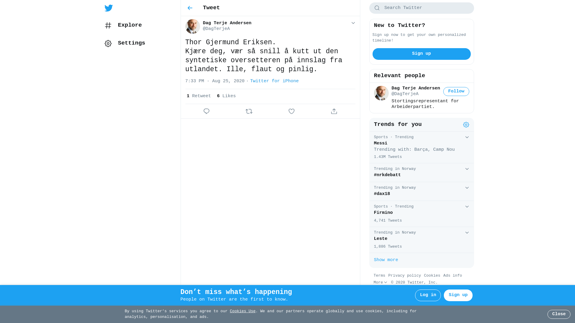 Thor Gjermund Eriksen. Kjære deg, vær så snill å kutt ut den syntetiske oversetteren på innslag fra utlandet. Ille, flaut og pinlig.