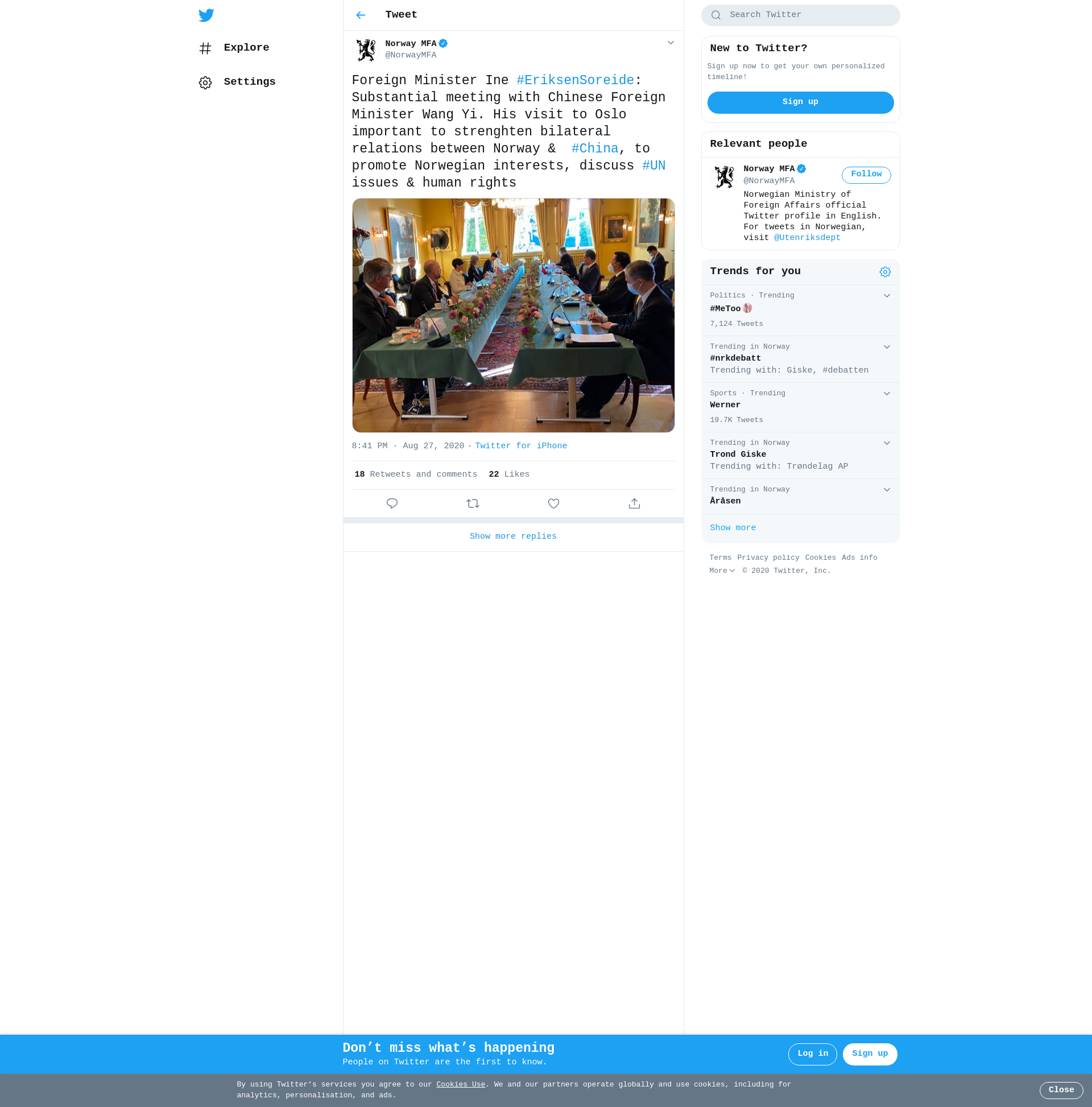 Foreign Minister Ine #EriksenSoreide: Substantial meeting with Chinese Foreign Minister Wang Yi. His visit to Oslo important to strenghten bilateral relations between Norway & #China, to promote Norwegian interests, discuss #UN issues & human rights https://t.co/TAg3BGQfxY