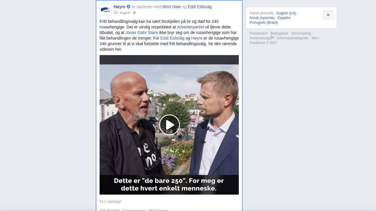 Fritt behandlingsvalg kan ha vært forskjellen på liv og død for 240 rusavhengige. Det er utrolig respektløst at Arbeiderpartiet vil fjerne dette tilbudet, og at Jonas Gahr Støre ikke bryr seg om de rusavhengige som har fått behandlingen de trenger. For Eddi Eidsvåg og Høyre er de rusavhengige 240 grunner til at vi skal fortsette med fritt behandlingsvalg. Se den rørende videoen her.